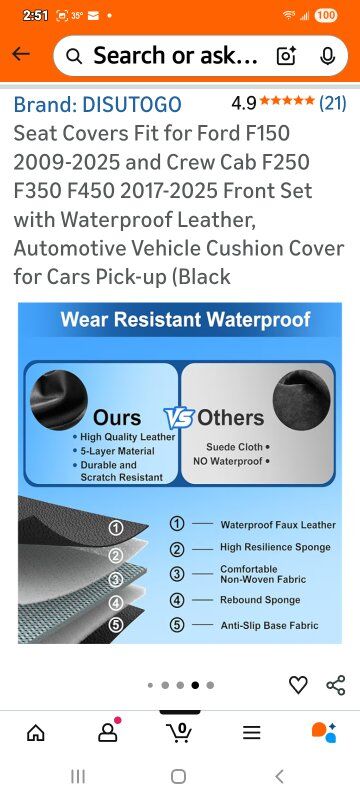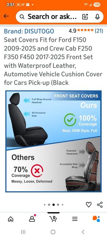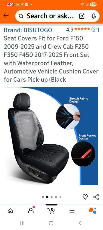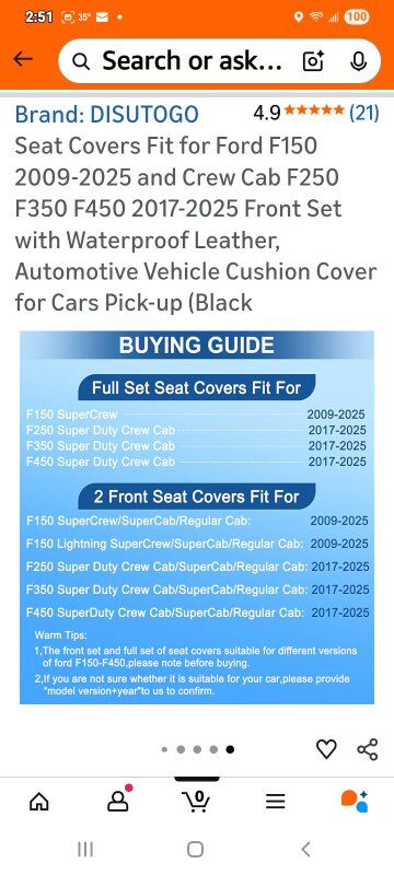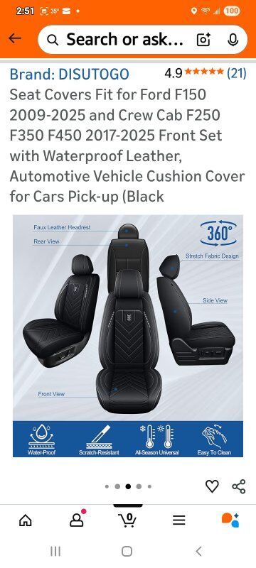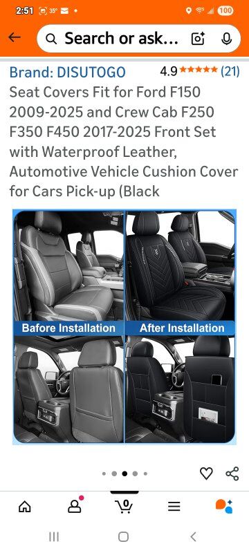 Brand-DISUTOGO Color-#110 Black Material-Faux Leather Auto Part Position-Front Manufacturer-DISUTOGO Perfect Fit for Ford F150: DISUTOGO car seat covers front set fit for Ford F150 2009 2010 2011 2012 2013 2014 2015 2016 2017 2018 2019 2020 2021 2022 2023 2024 2025,fit for F250 F350 F450 2017 2018 2019 2020 2021 2022 2023 2024 2025. Premium Synthetic LeatherThe leather seat covers for F150 made with high-quality synthetic leather, these seat covers are durable and smooth. They’re waterproof, easy to wipe clean, and hold up well to daily use, keeping a neat look. Engineered for Airbag Function: Truck seat covers use specialized sewing techniques at exit points, with careful attention to airbag placement. This ensures airbags deploy without obstruction, maintaining full safety performance. Trendy Style: Leather bucket seat covers made of faux leather with simple, classic features and one-of-a-kind embroidery. Bright, smooth lines add color to decor. Simple Install: Custom fit seat covers come with installation instructions in the pack. Just follow them—setup takes only 20-30 minutes usually.