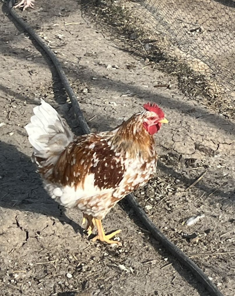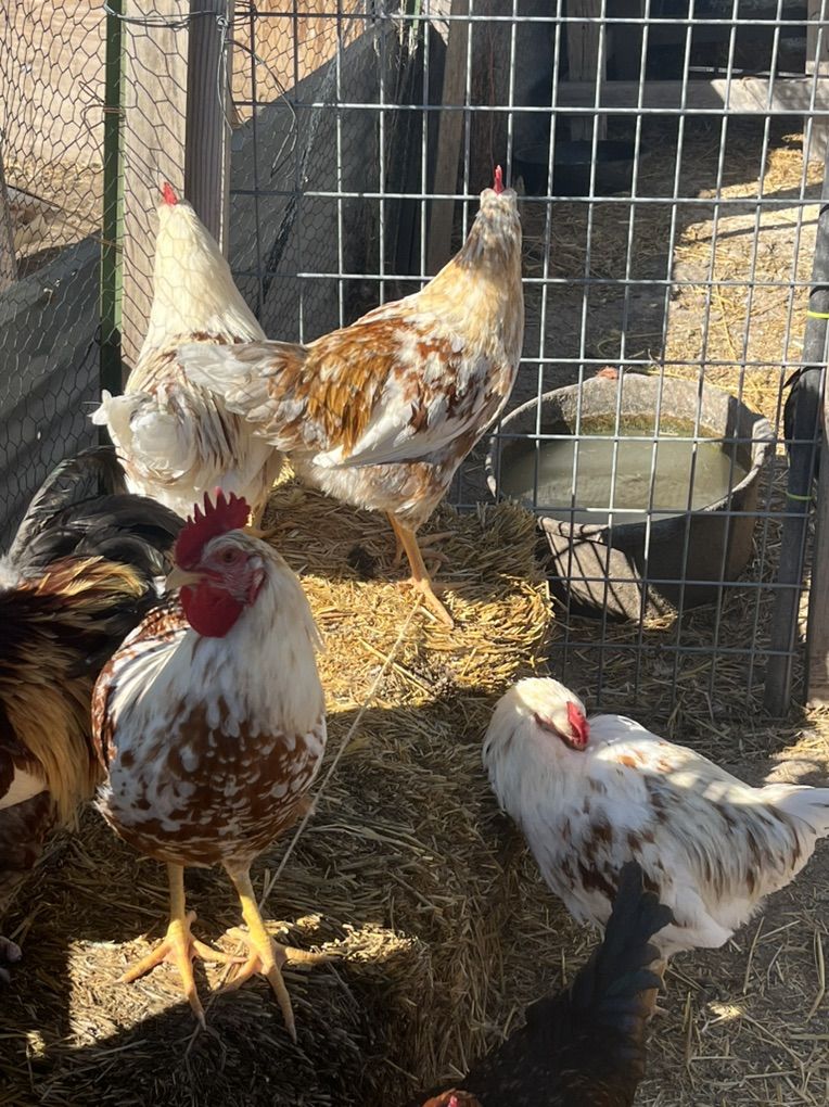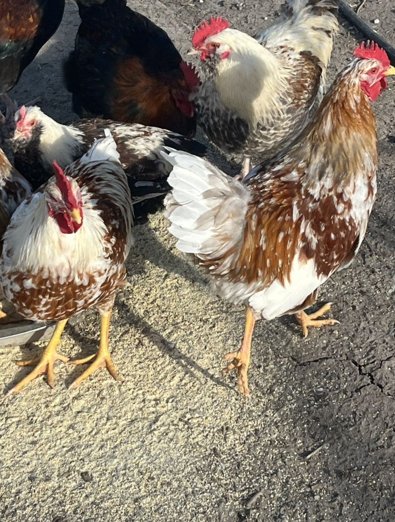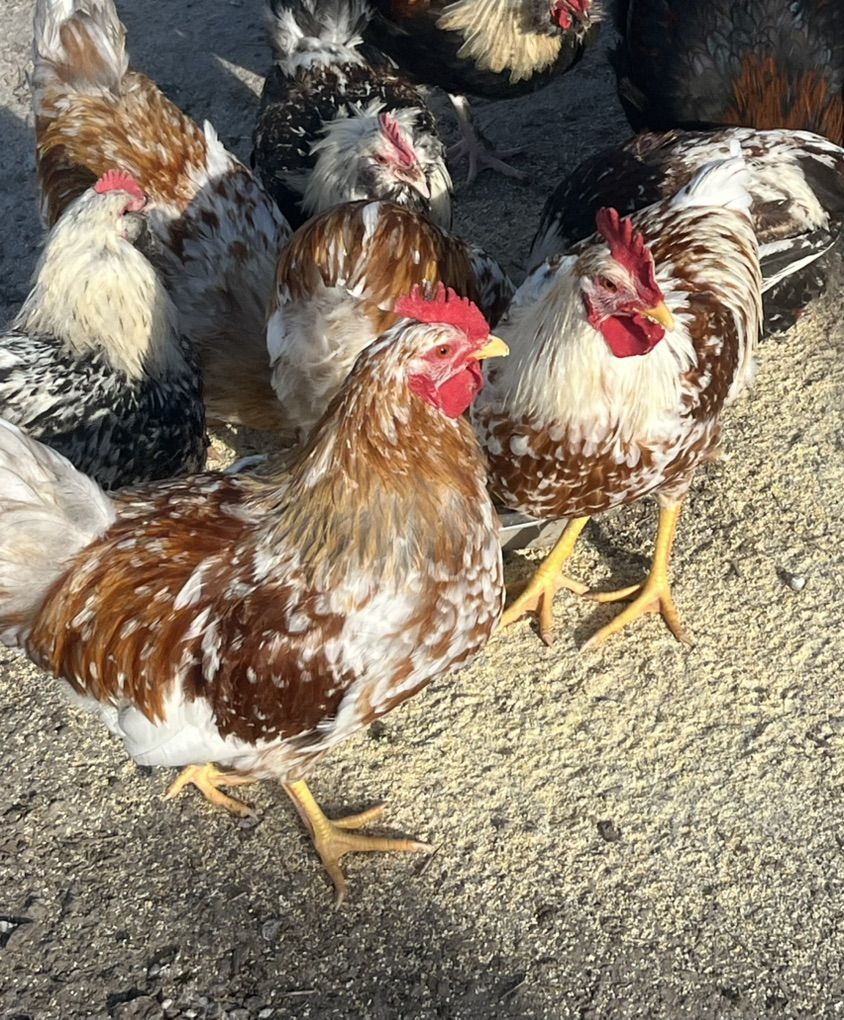 Venmo7-8 month old young roosters-Purebred “Swedish Flower Hens” These chickens were hatched out from red and white rooster and grey speckled hens. The last two pics are of mother and father. This is a rare breed and regarded as an “endangered “ breed of chicken I have 7 available roosters. $15 each for roosters