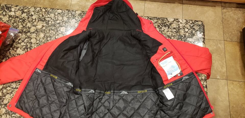 HOODED WINTER COAT, RED EXTERIOR/BLACK INTERIOR, WOMEN/MEN SIZE LARGE (FITS MORE LIKE AS MEDIUM). HAS BUILT IN HEATING COIL FOR EXTRA WARMTH, USB RECHARGEABLE HEAT. ON/OFF SWITCH. BE READY NOW FOR THE UPCOMING COLD MONTHS. PERFECT GIFT FOR CHRISTMAS OR READY FOR THE SNOW AND COLD WEATHER. PICK UP ONLY. CASH ONLY.