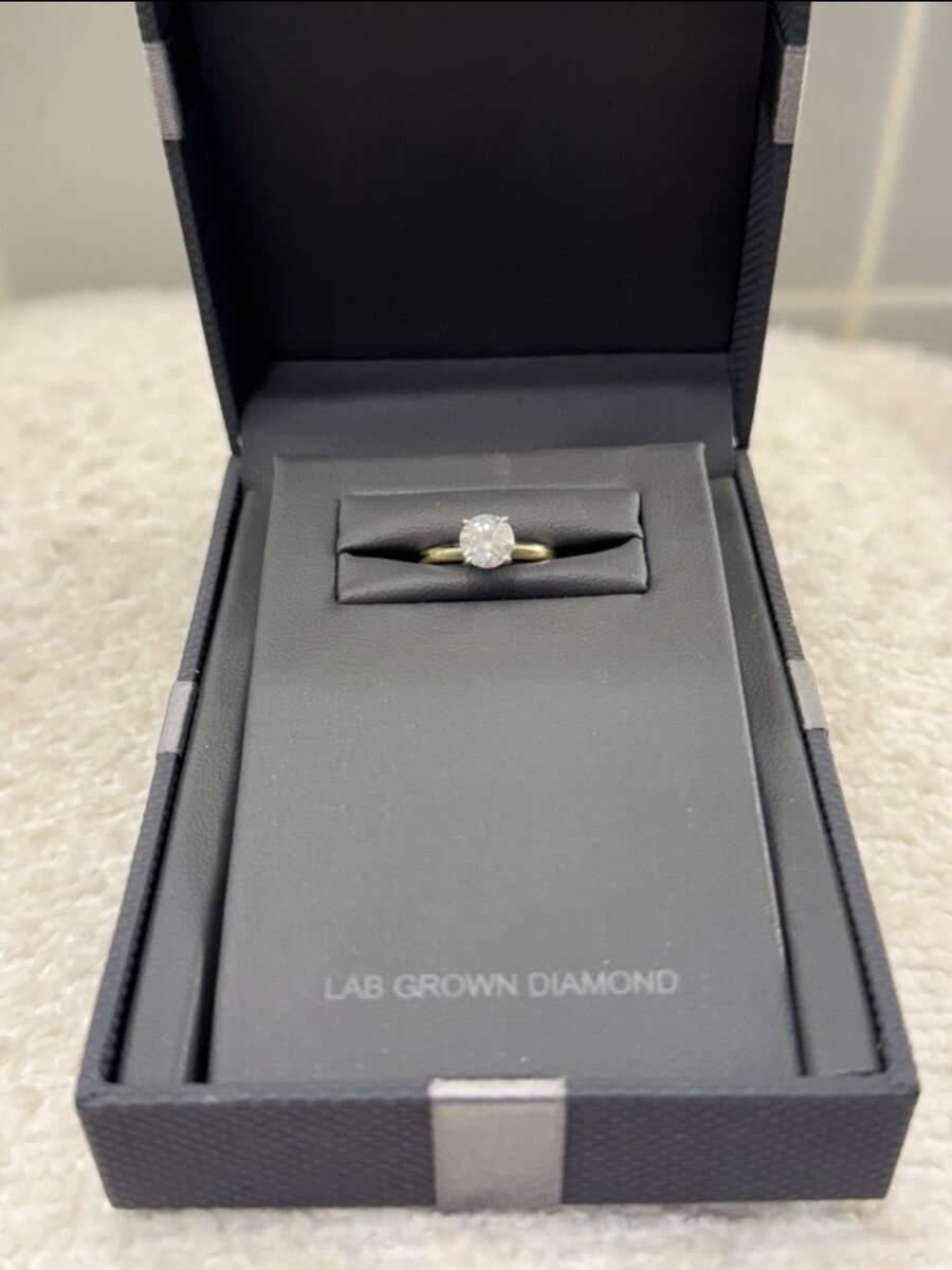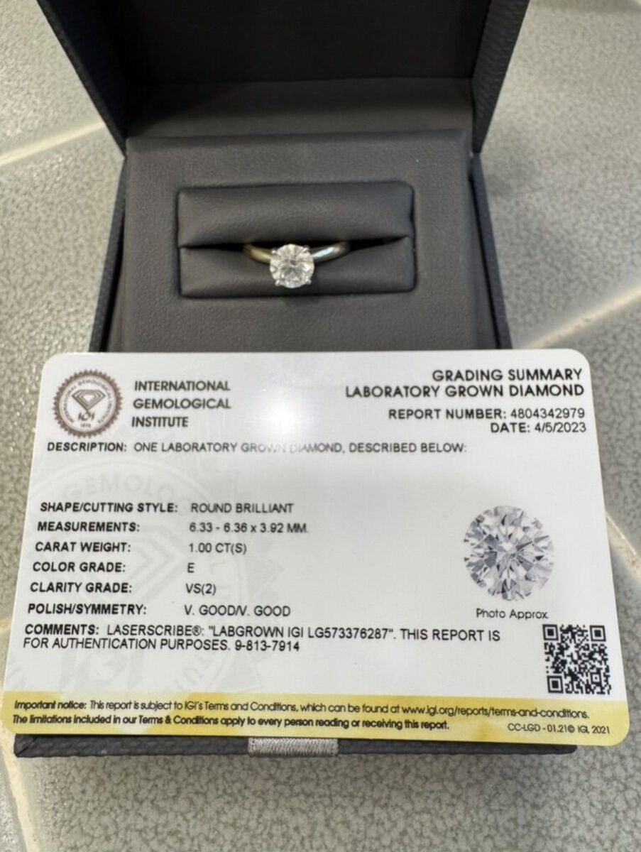 PayPalRound, brilliant cut, 1 carat, VS 2, color E certified by IGI, size 5, lab grown diamond ring.