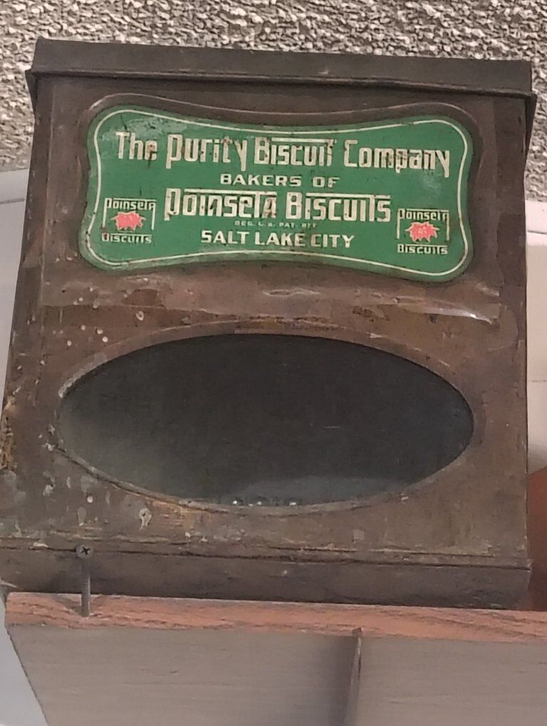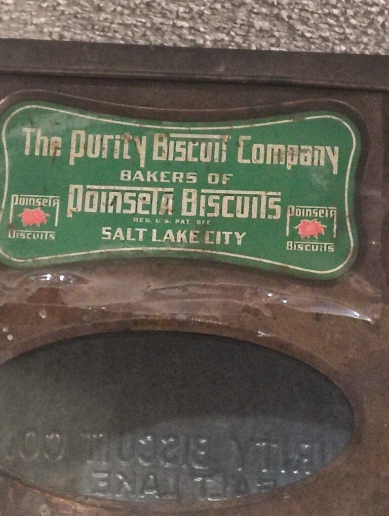 super rare antique Salt Lake City Utah collector container with the original sign in the original glass from the purity biscuit company 1920s in very good condition even the metal box says Salt Lake on the back $525 very few of these have been found around 100 years old. for sale in West valley