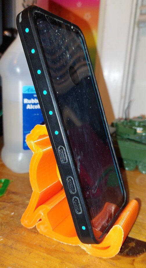 4" by 8 1/2" by 1 1/2" This phone holder is rigid meaning it won't break if you drop it. The back of the cat is at an angle so you can see the screen without worrying about how to prop it up. The cat is a bright neon orange. Has never been used since it's creation. Very useful for trying to pack light.