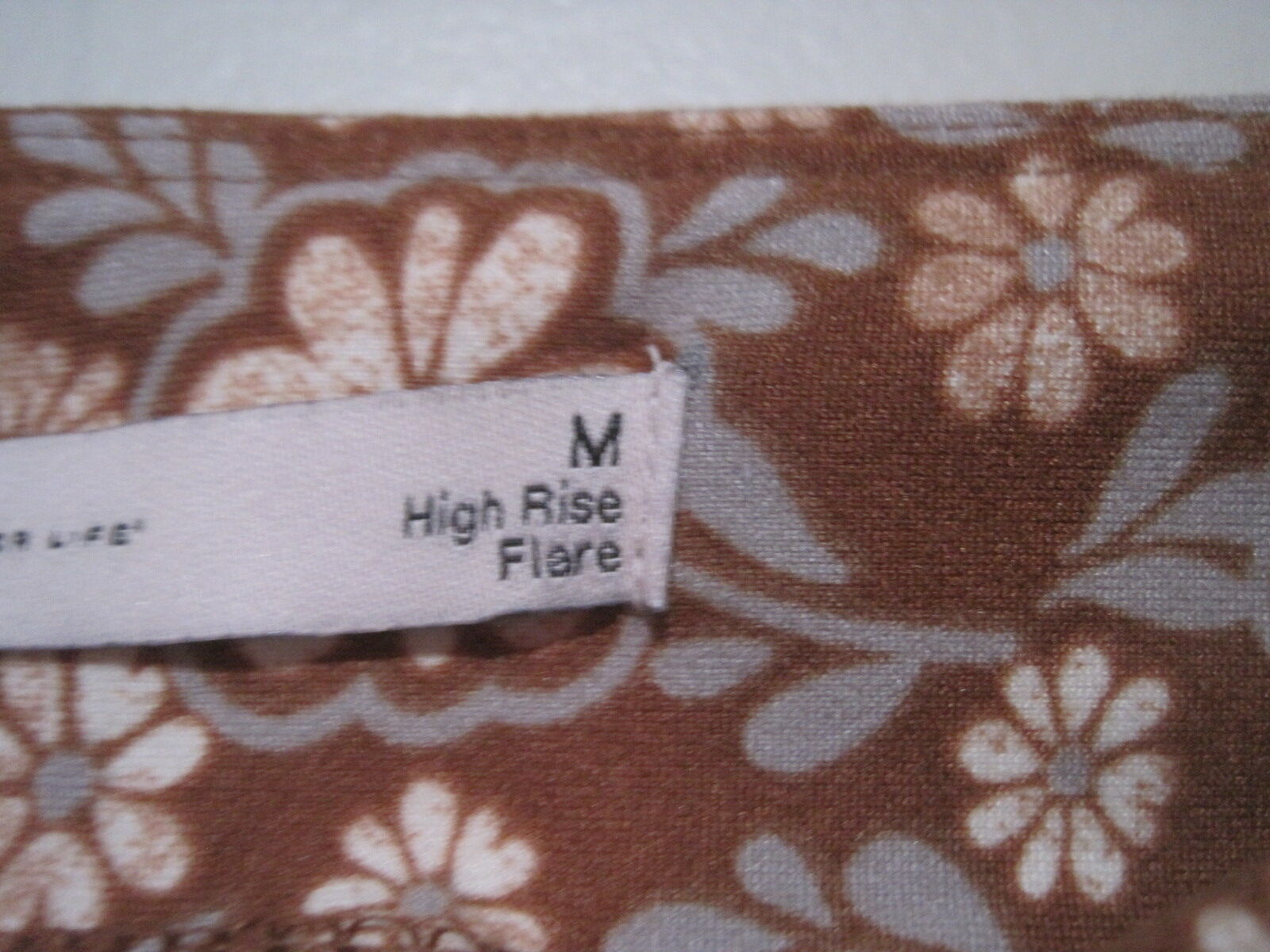 The SO Pants Women's Medium Leggings come with a floral pattern with a high rise flare. These leggings feature a pull-on closure, elastic waist, and 31-inch inseam. Made from polyester and spandex, they are lightweight, comfortable, and stretchy, making them suitable for winter, fall, and spring seasons. The brown color and nature-themed design make them perfect for travel, parties, and casual occasions, adding a touch of fun and retro flair to the wearer's outfit.