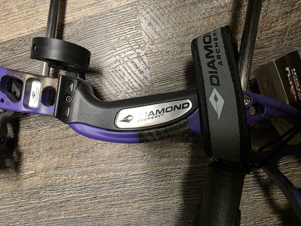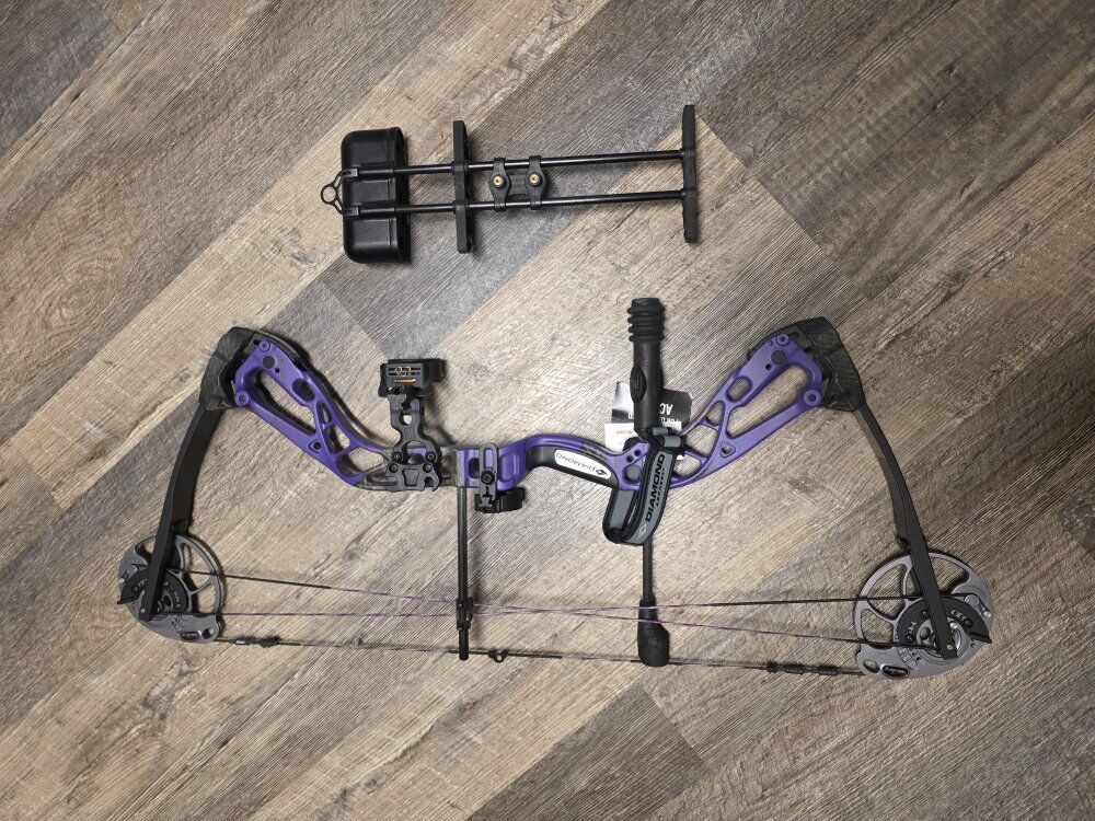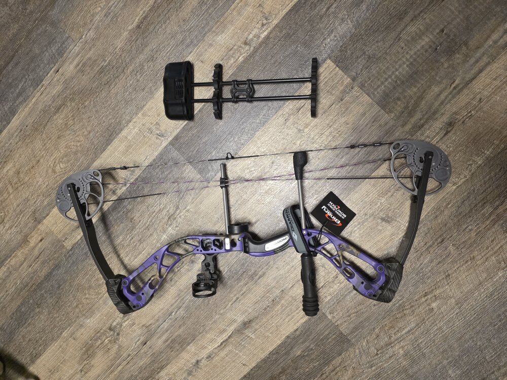 ZellePurple Camo Compound Bow. I got this for Christmas but never use it. A good friend was looking at it when I got it and accidentally dry fired it and will need some repairs. Still have the tags on it. Has never seen an arrow. Comes with everything in the pictures. $225 OBO!