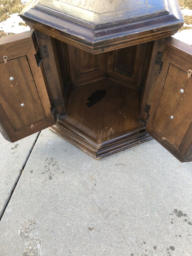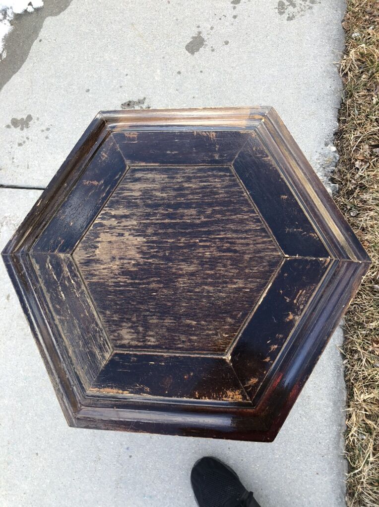 Selling this table, very cool design. My wife had the intention to refinish it and bring it back to life but has been way too busy to get around to it. It’s very sturdy, very nice refinishing project.