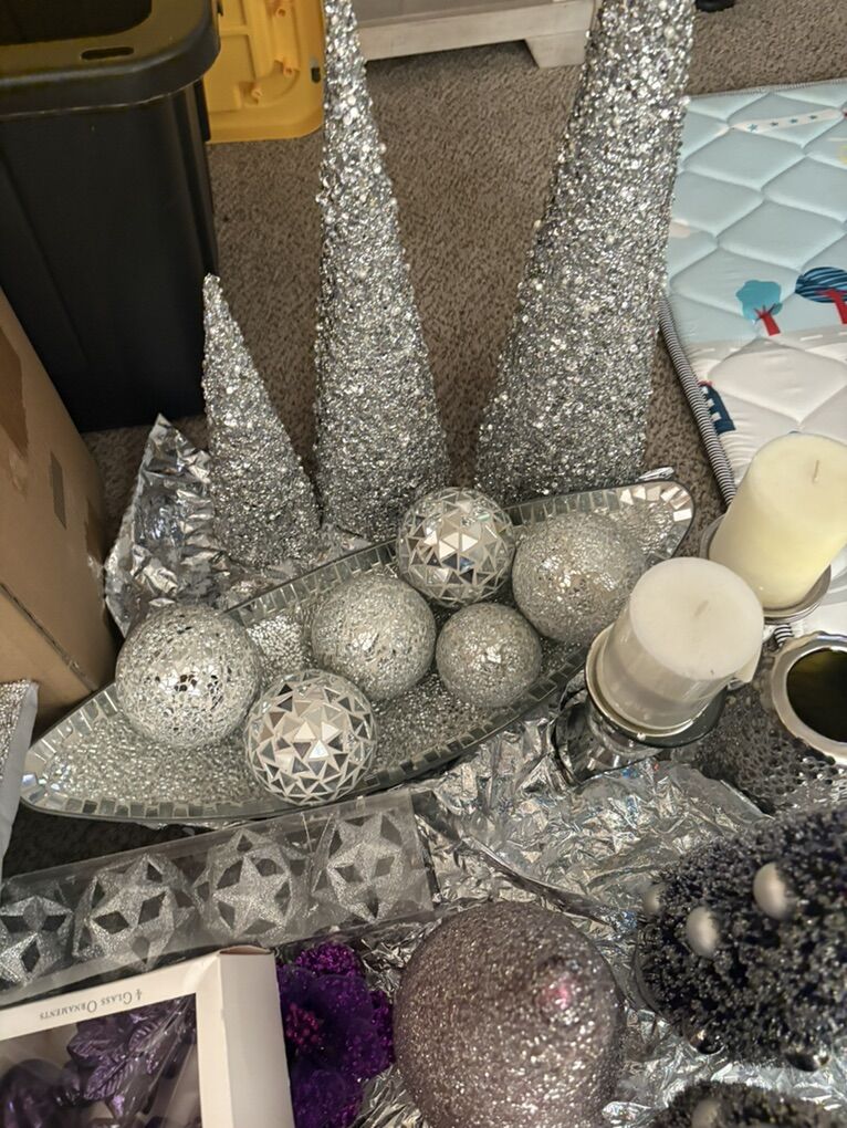 VenmoLots of Decoration for Christmas. Colors are silver, purple, pink.