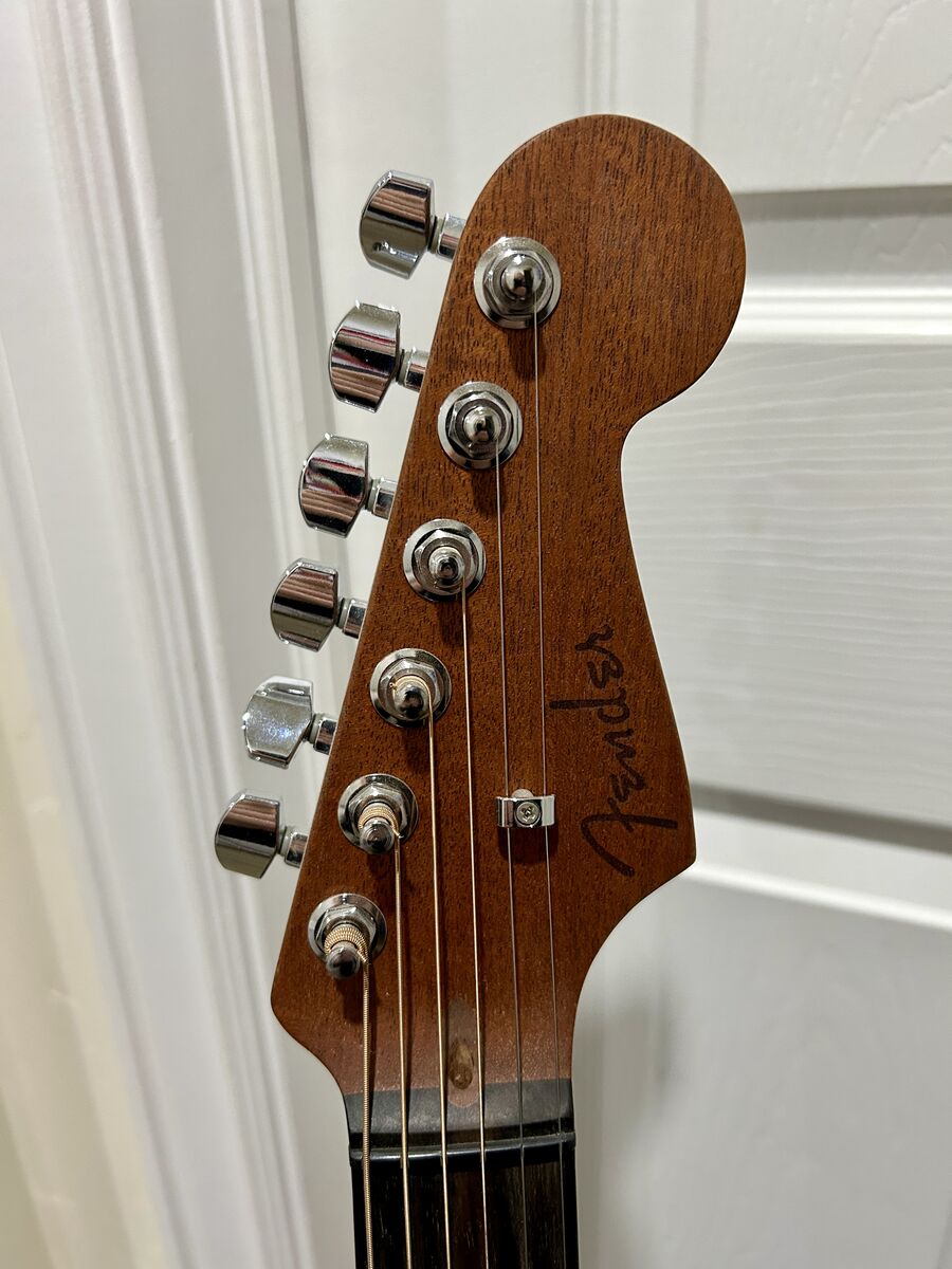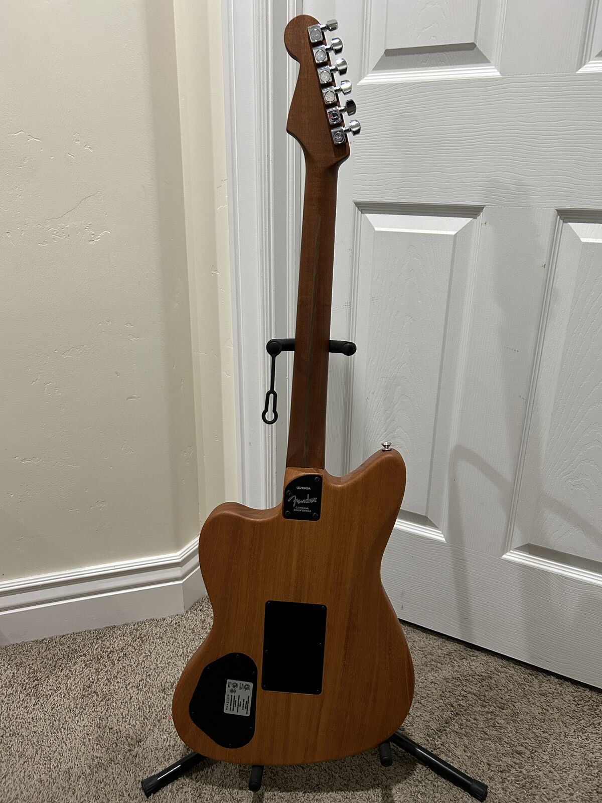 This is a mint Fender American Acoustasonic Jazzmaster acoustic-electric guitar. At the heart of the American Acoustasonic Jazzmaster are three pickup systems—the mint Fender Acoustasonic Shawbucker, a Fishman undersaddle transducer and a Fishman Acoustasonic Enhancer—that deliver a spectrum of acoustic and electric voices. A built-in rechargeable lithium-ion battery provides up to 20 hours of playing time on a single charge while also supporting simultaneous charge and play. The offset spruce and mahogany SIRS body resonates like an acoustic while avoiding feedback and the slim, fast-playing neck provides effortless electric-style playability across the 22-fret ebony fingerboard. Includes a Fender Deluxe 1225 Gig Bag with all the "case candy".