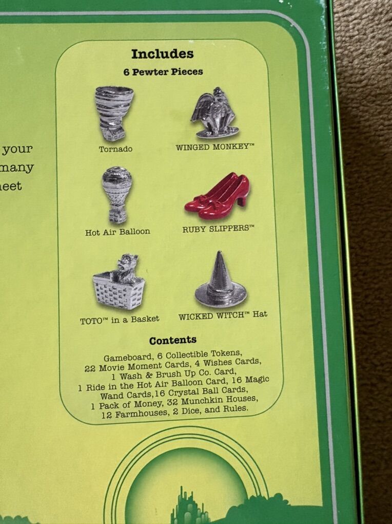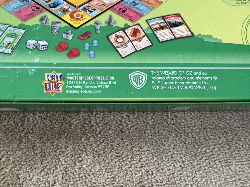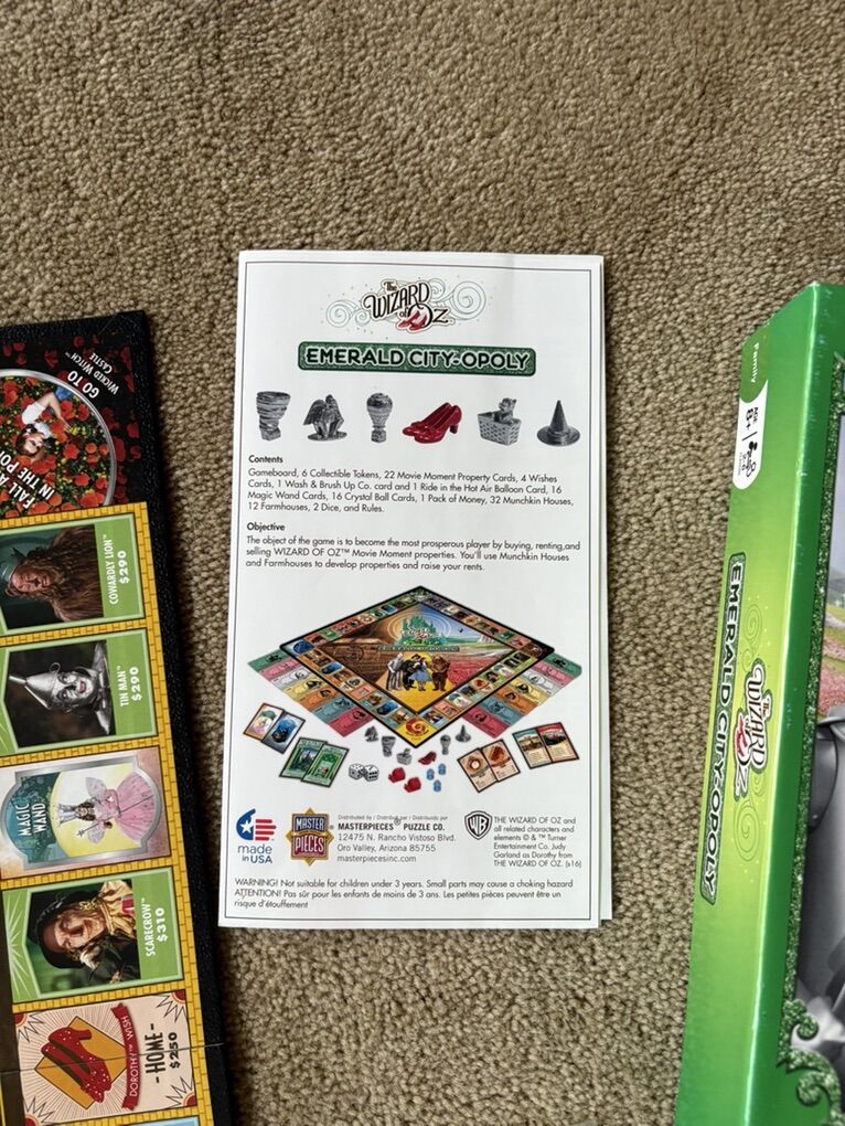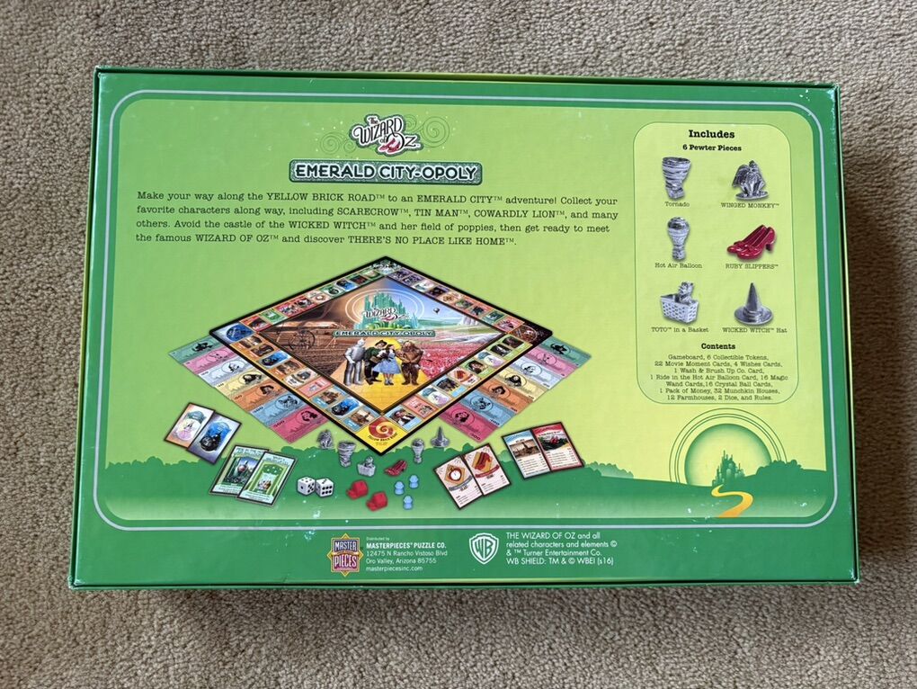 COMPLETE/NEW (most components sealed) Emerald City-opoly Board Game: A Monopoly-style game based on the original The Wizard of Oz movie, by Masterpieces, Turner Entertainment. 2-6 players, ages 8+. Complete, no missing pieces, NEW, unused condition. Text only. Cash or Venmo.