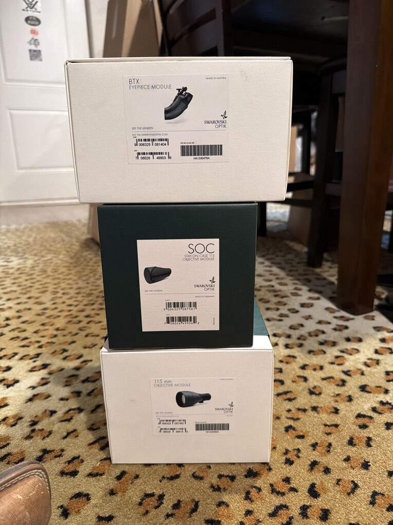 Swarovski 115mm Objective Spitting scope with BTX eyepiece and objective case. Still have original boxes. Invested over $7500 in setup. Selling for $6000. Call or text Brandon @ (801) 9zero6-one5three6 8019061536