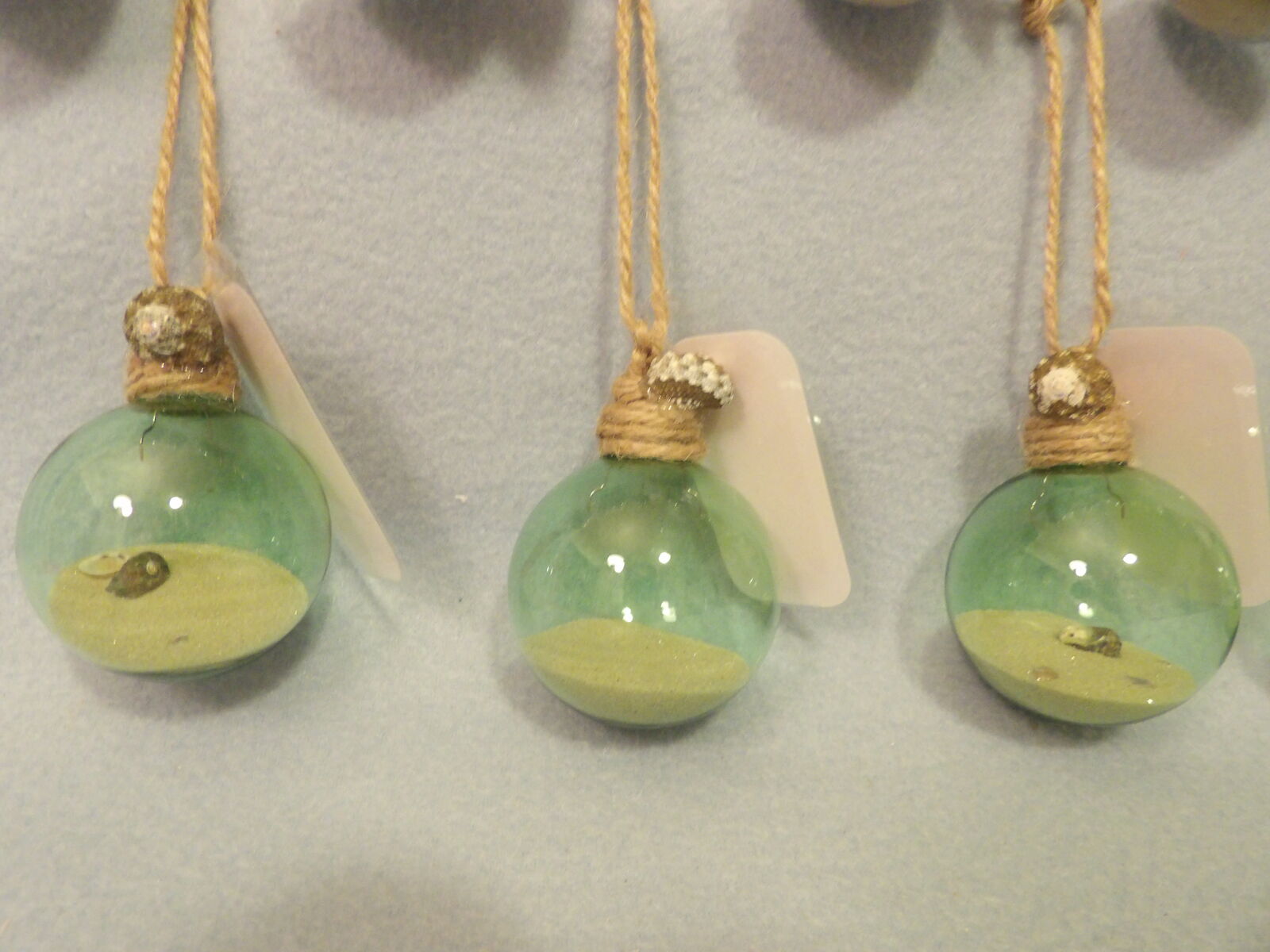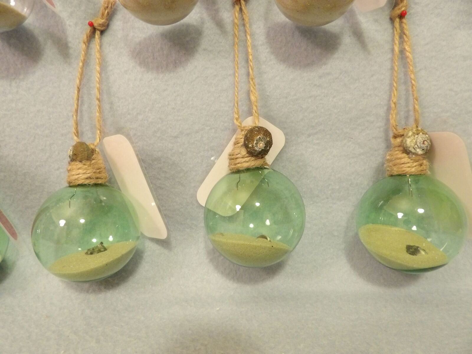 $6 each for the larger green glass ornaments (or 6 for $30)