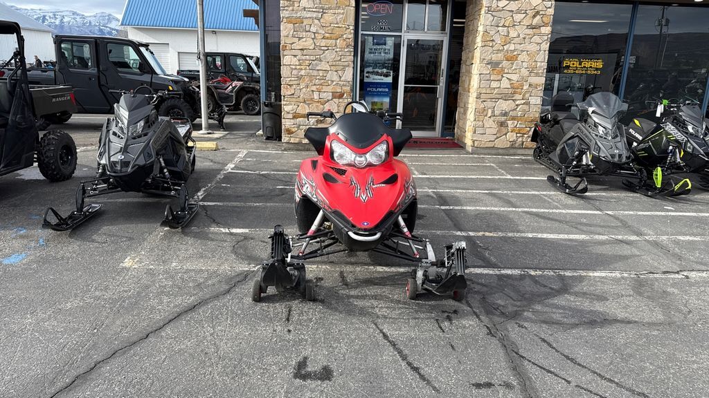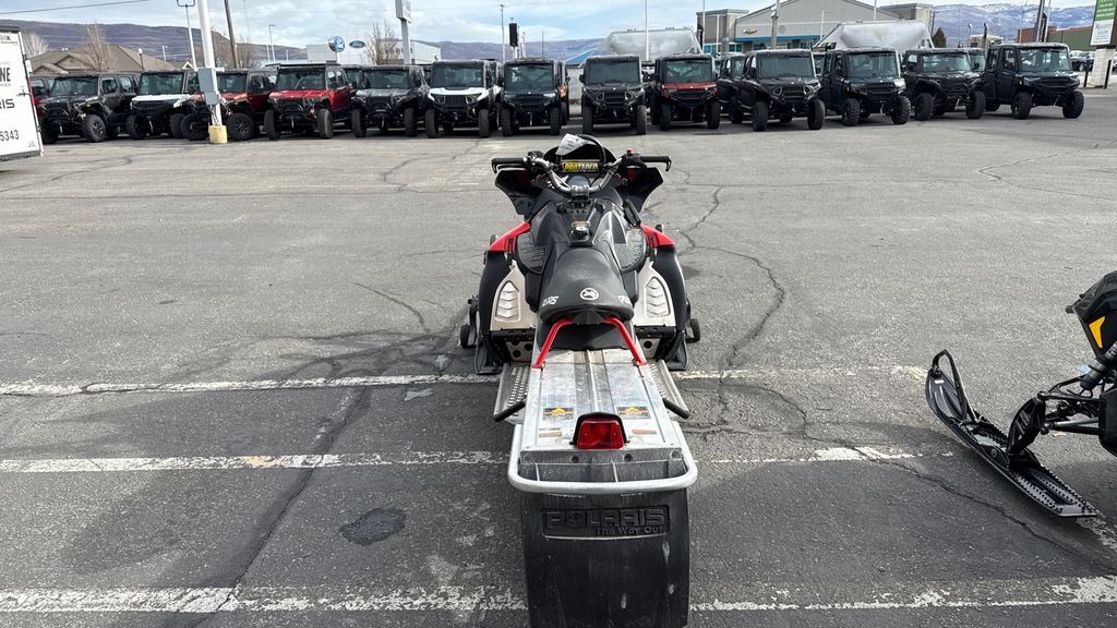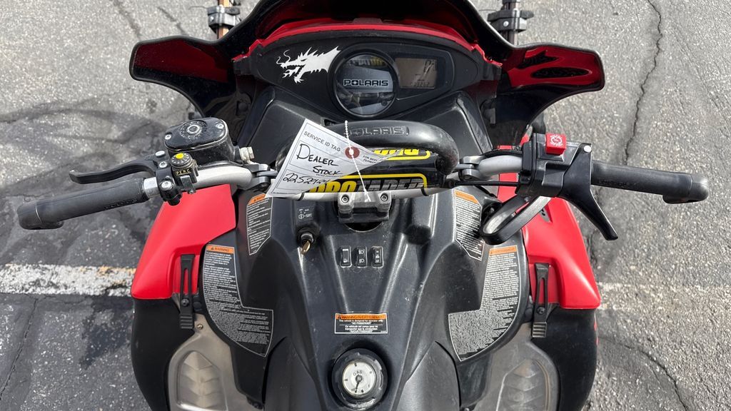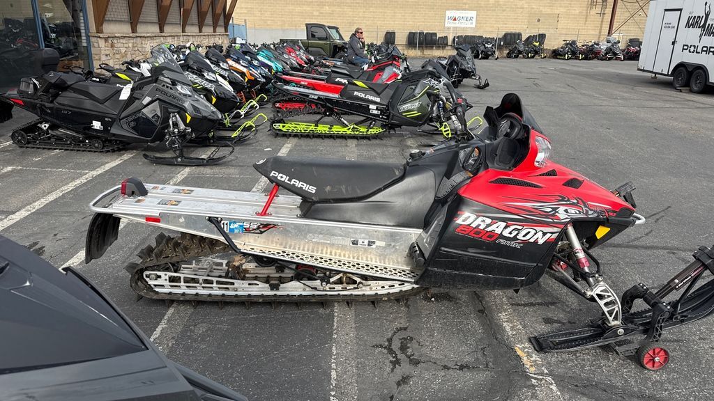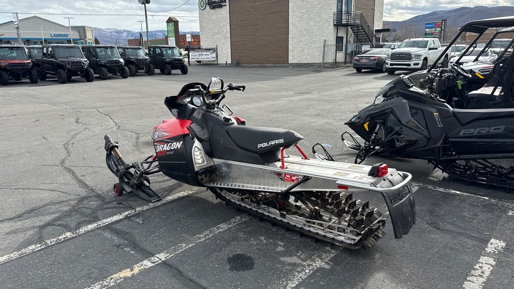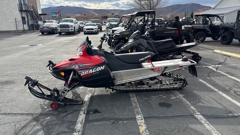 The 2010 Polaris RMK 800 Dragon (155-Inch) is a powerful mountain snowmobile equipped with a 795cc, liquid-cooled, horizontal inline, reed valve, 2-stroke engine. It features a Continuously Variable Transmission (CVT) and an independent A-arm front suspension with 9 inches of travel. The snowmobile weighs approximately 487 lbs and has a rear suspension with 15.5 inches of travel. It is designed for deep snow performance, making it suitable for challenging mountain terrain.