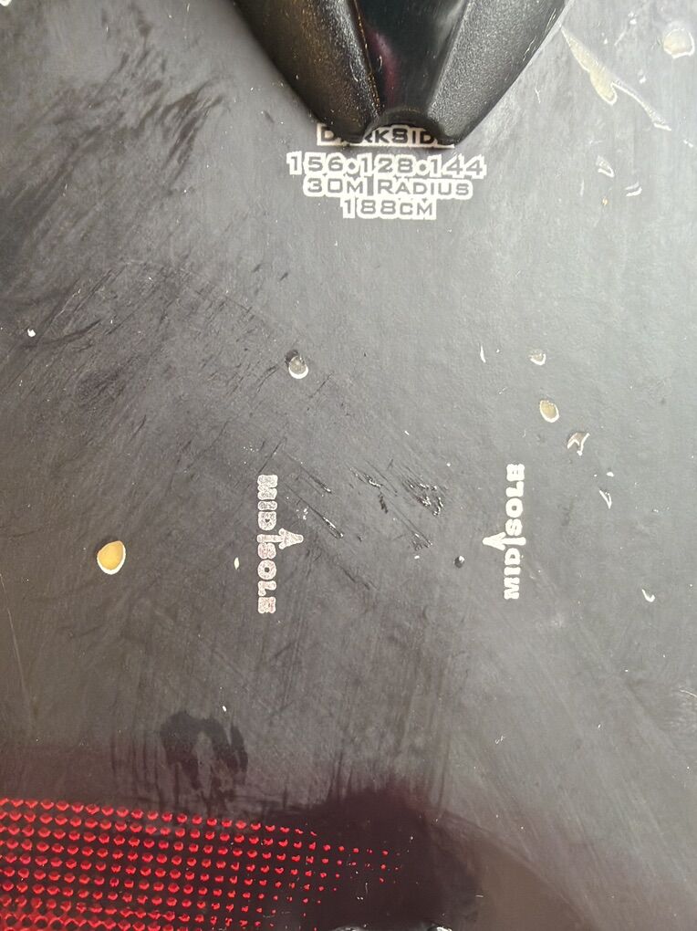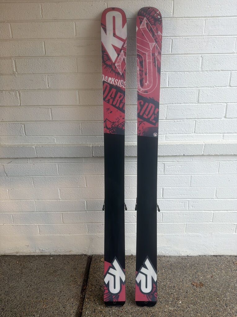 K2 dark side skis Sick powder ski. 188 cm length at 128 cm under foot and 156 cm shovel with rocker with a 144 cm tail. Rossignol Axial 2 binding with 4-14 DIN.