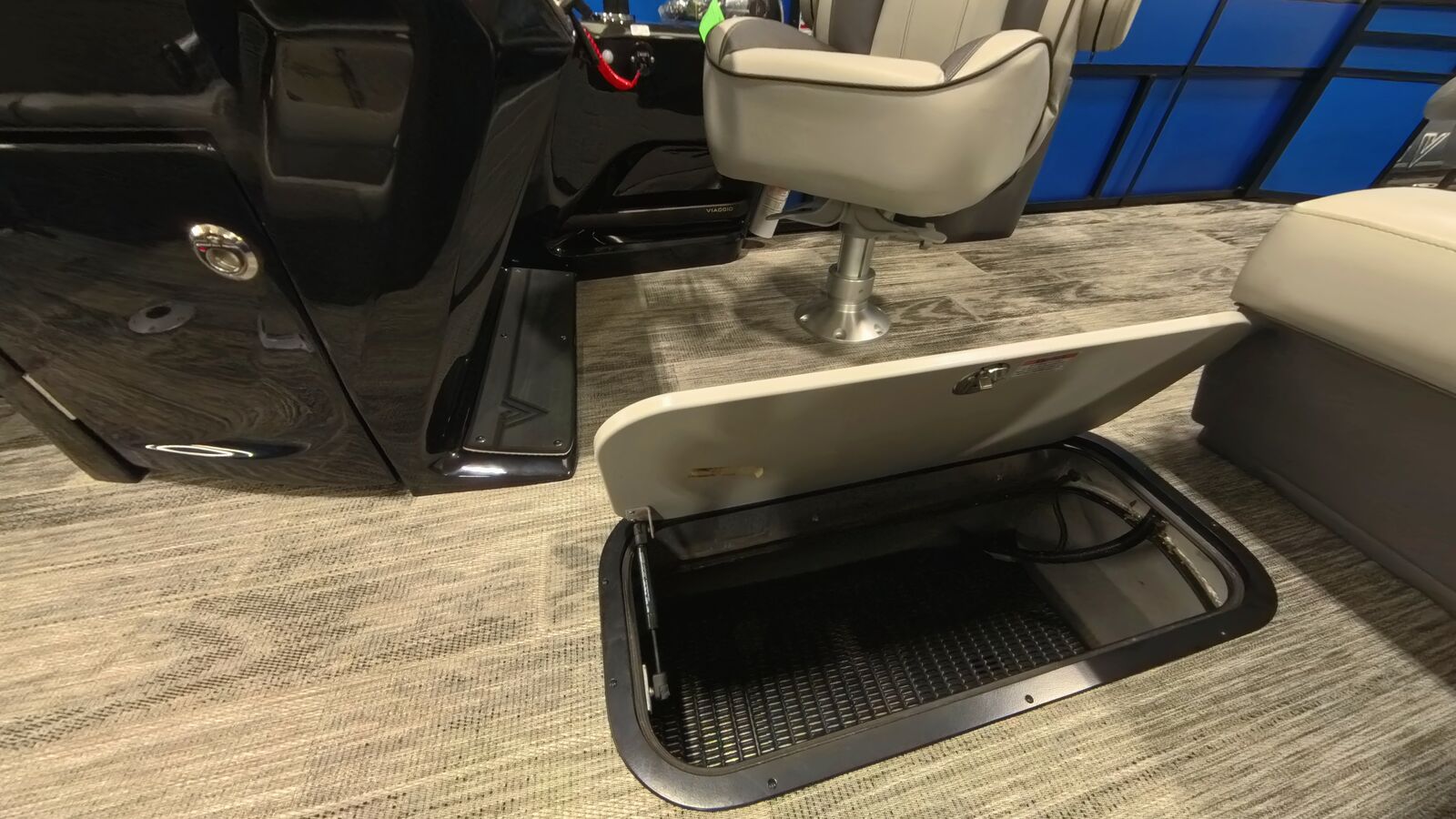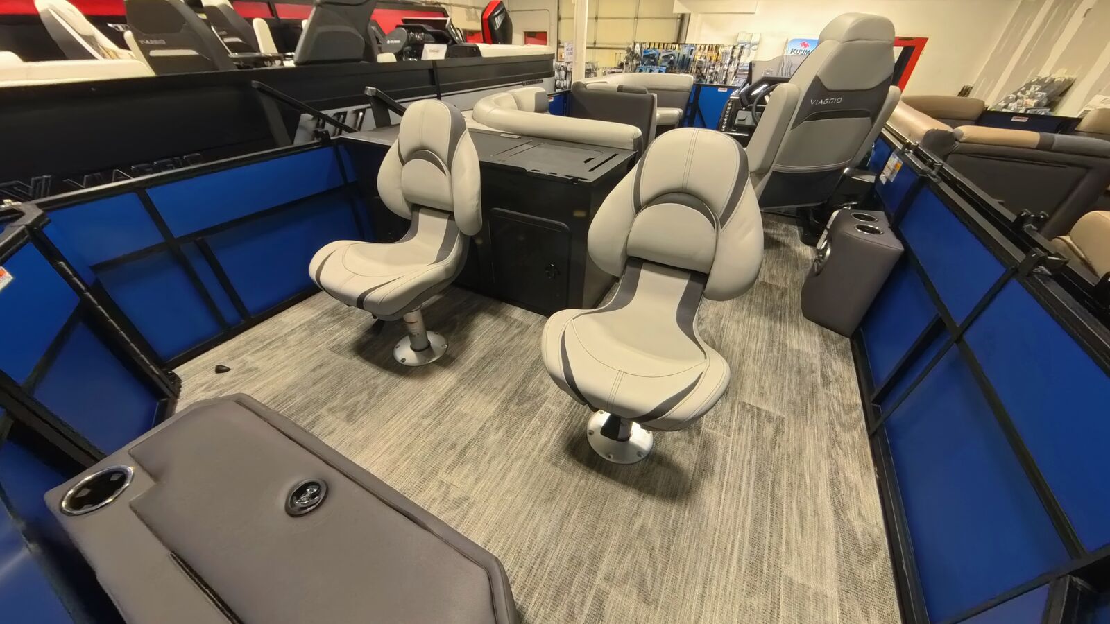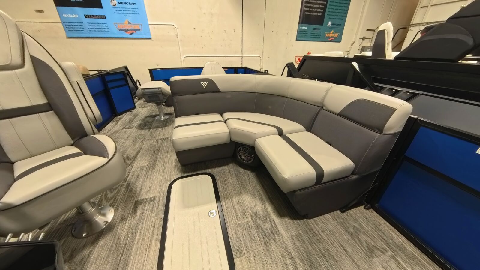 The ACR battery management system ensures reliable power, while the gas assisted seat pedestal provides smooth adjustment at the helm. Tube protectant helps preserve the toons over time. The Lakeport Plank Flint flooring offers durability and comfort underfoot.