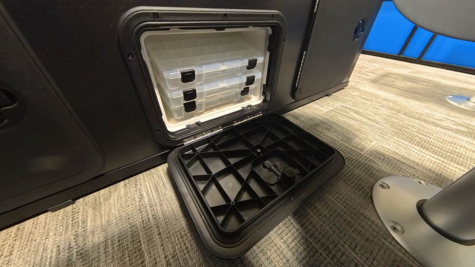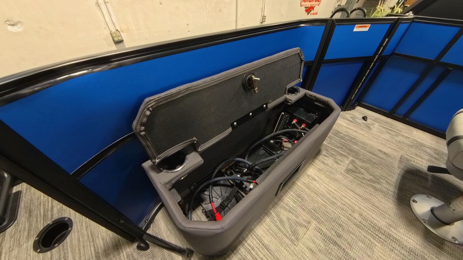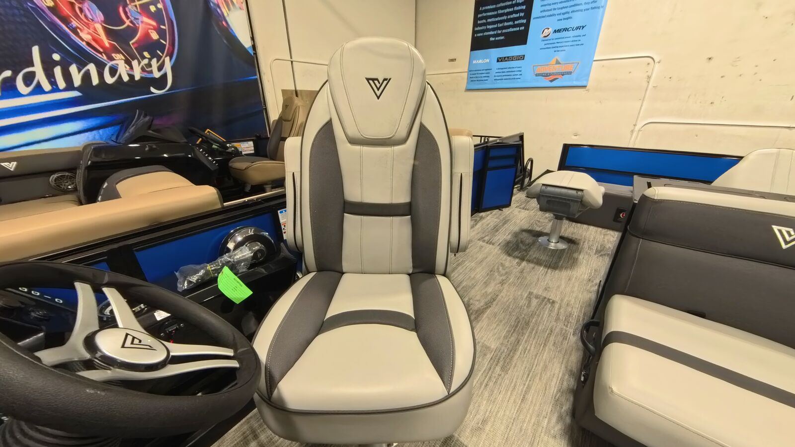 The ACR battery management system ensures reliable power, while the gas assisted seat pedestal provides smooth adjustment at the helm. Tube protectant helps preserve the toons over time. The Lakeport Plank Flint flooring offers durability and comfort underfoot.
