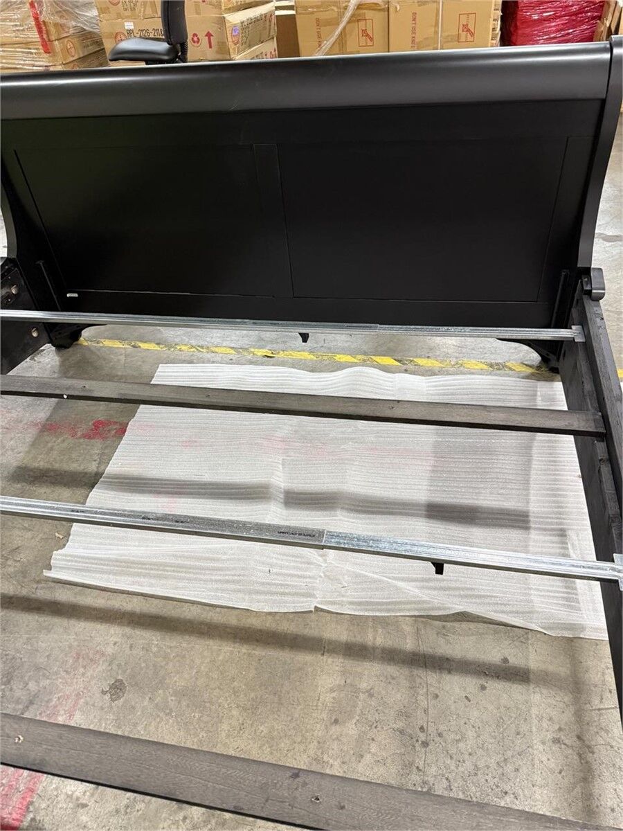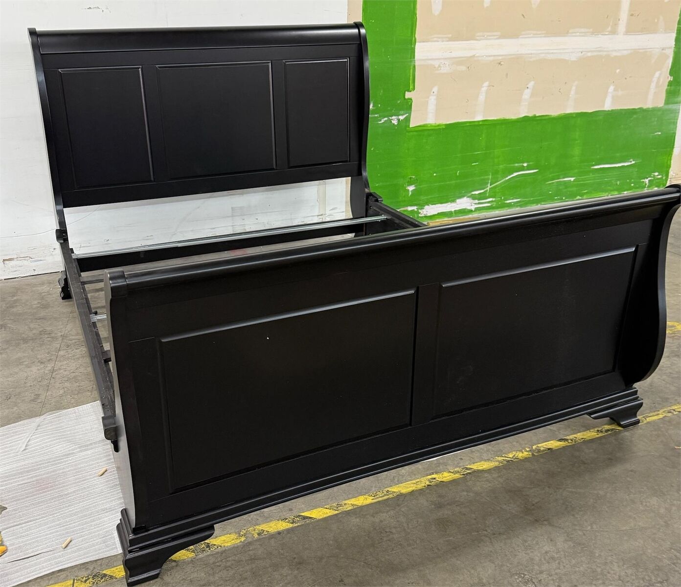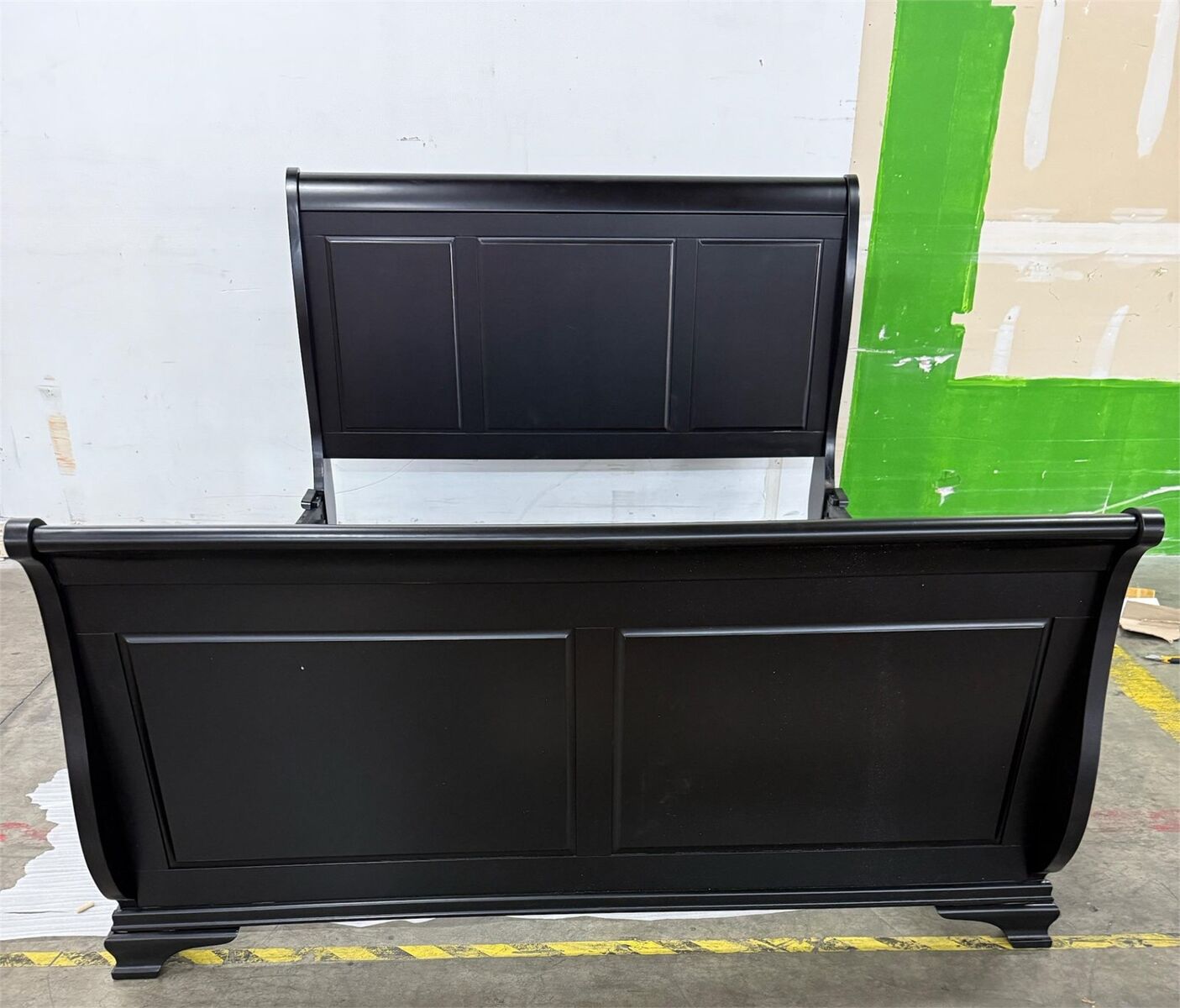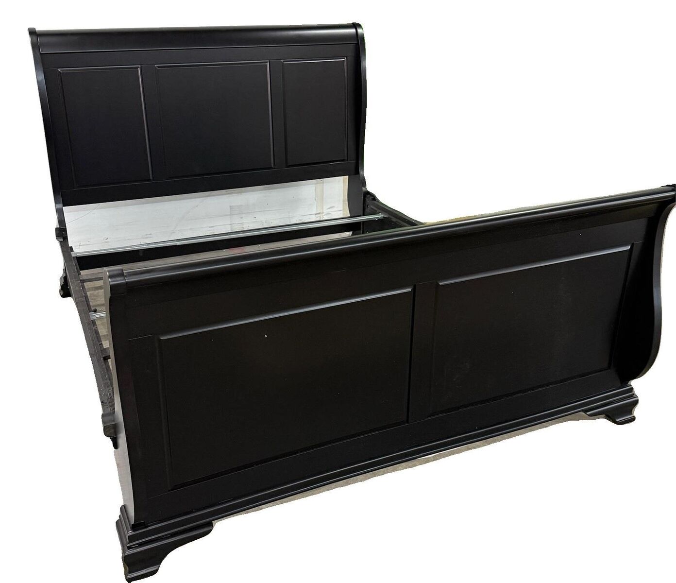 This solid wood California king sleigh bed features a sleek all-black rubbed finish, adding a touch of elegance to any bedroom. The design includes a gracefully curved headboard and footboard, complemented by panel detailing that enhances its classic appeal. Constructed from durable materials, this bed frame is designed for longevity and stability. The slatted support system ensures a sturdy foundation for your mattress. Ideal for those seeking both style and comfort, this bed is a perfect centerpiece for a modern or traditional decor.