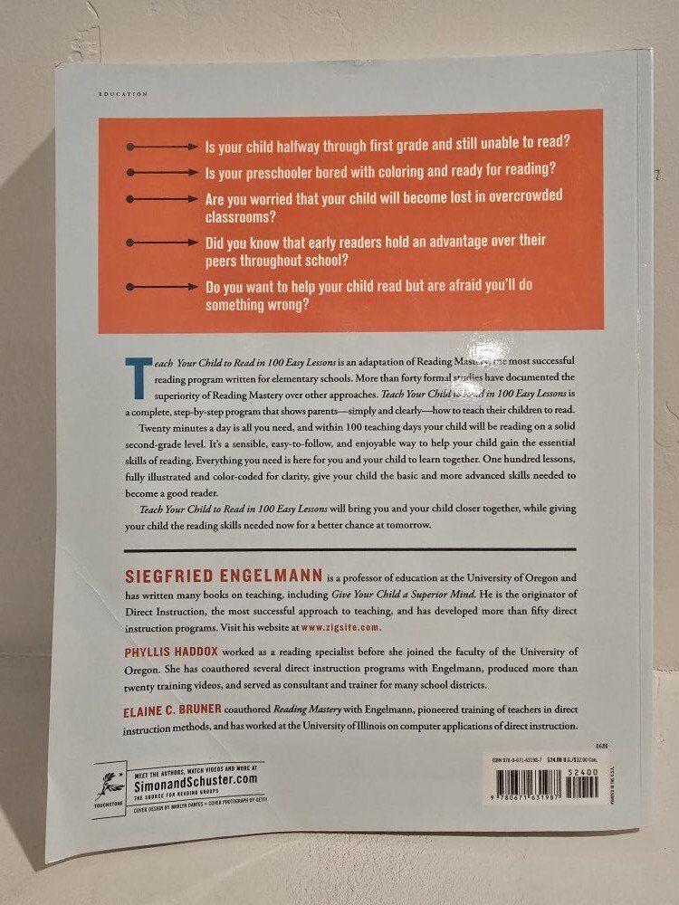 Zelle"Teach Your Child to Read in 100 Easy Lessons: Revised and Updated Second Edition" by Elaine Bruner, Phyllis Haddox, and Siegfried Engelmann is a comprehensive textbook designed for homeschooling and early childhood education. This revised edition includes updated content and features 420 pages of engaging lessons to help parents teach their children to read. With a focus on reading and phonics, this trade paperback book provides practical teaching methods and materials for preschool, kindergarten, and elementary school-aged children. Perfect for parents looking to actively participate in their child's education, this book offers a clear and structured approach to teaching reading skills.
