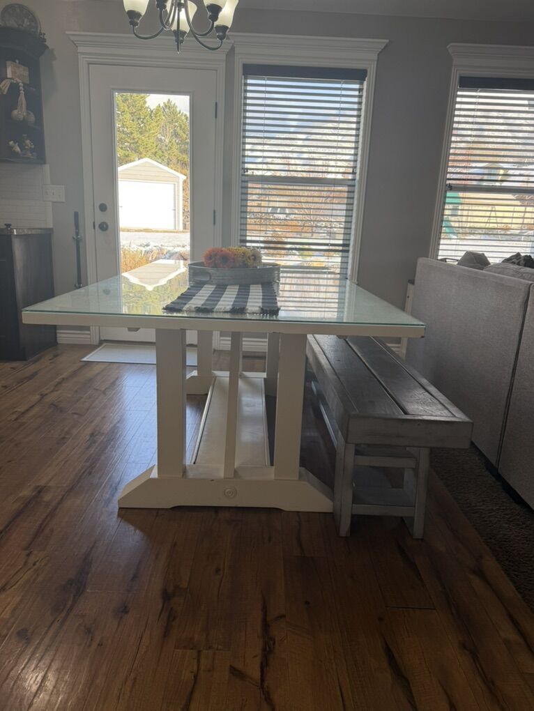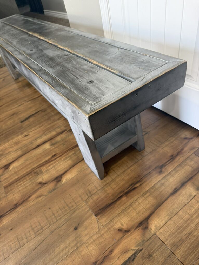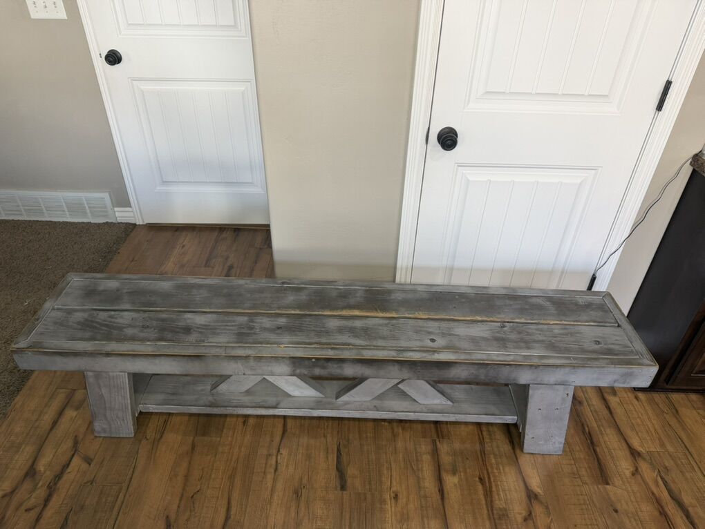 ApplePayMade from scratch, farmhouse bench. Can be used for decor or at the table like shown in the last image. It is solid wood in great condition. However, It could use some staining or painting.