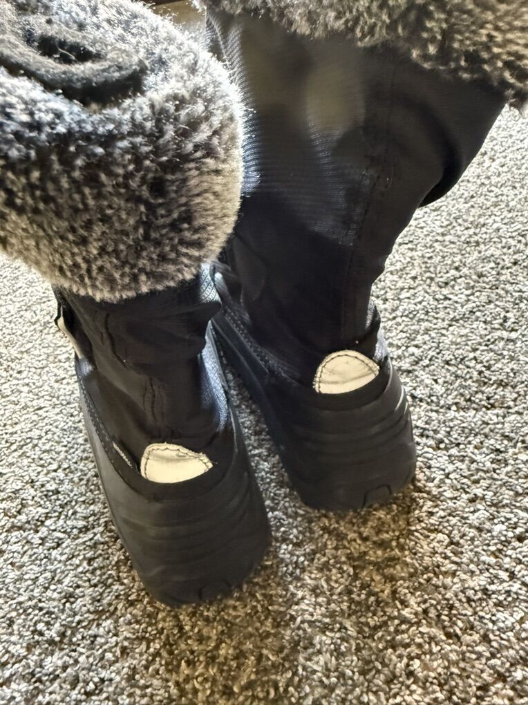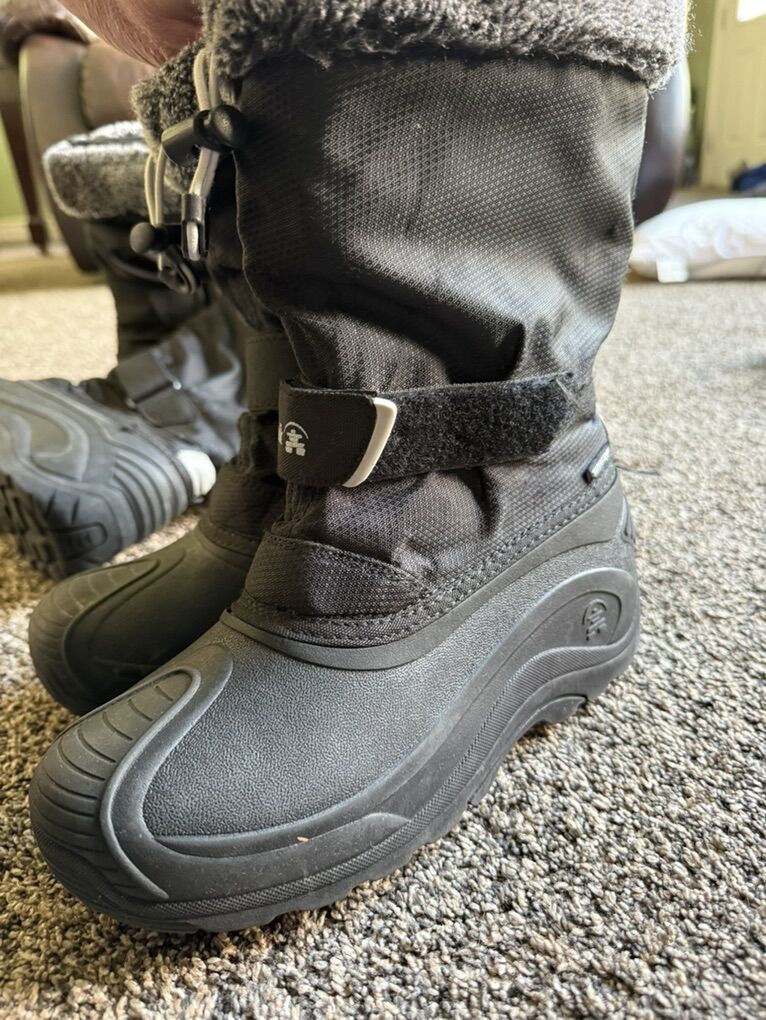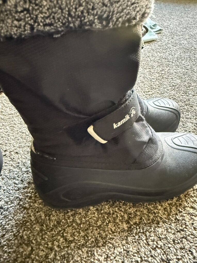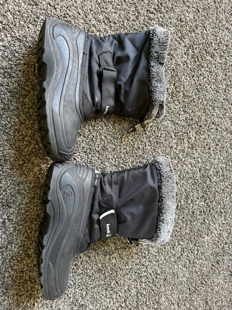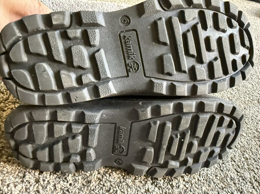 ZelleThese Kamik Water Bug Waterproof Boots in size 5 for big kids are perfect for winter snow adventures. Not to be confused with other versions that are not cold rated for -40°, these boots are a must with kids who love outdoor adventures to keep their feet dry and warm. With a round toe shape and solid black color, these boots feature a rubber outsole for traction and a waterproof synthetic upper for protection. Designed for walking and outdoor activities in cold weather, these boots are both stylish and functional, keeping feet dry and comfortable in snowy conditions, but also work great for rain. Perfect for both boys and girls, these Kamik boots are gently used with minimal wear as shown in photos. Our boys wore them very little due to minimal snowfall the past two seasons and just grew out of them. They are listed right now on Backcountry for $69 each. I am asking $25 each which is a fraction of the original price. Text Anne 8017557770