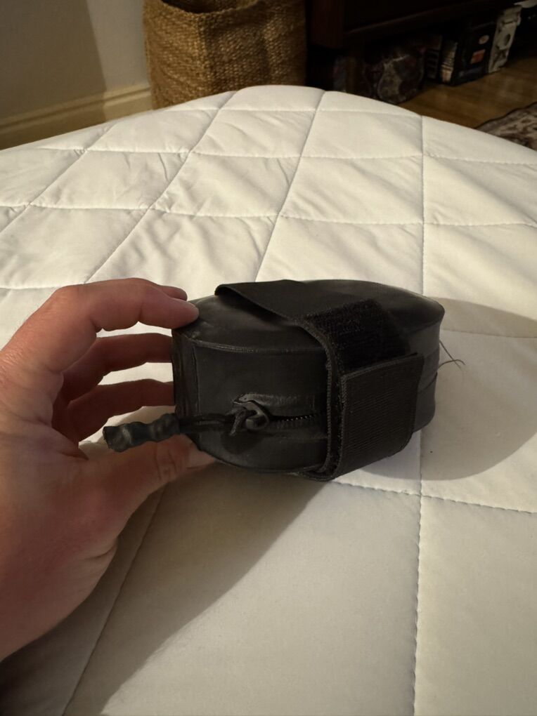 Water-resistant. Great for a flat kit and a key. Matte black.