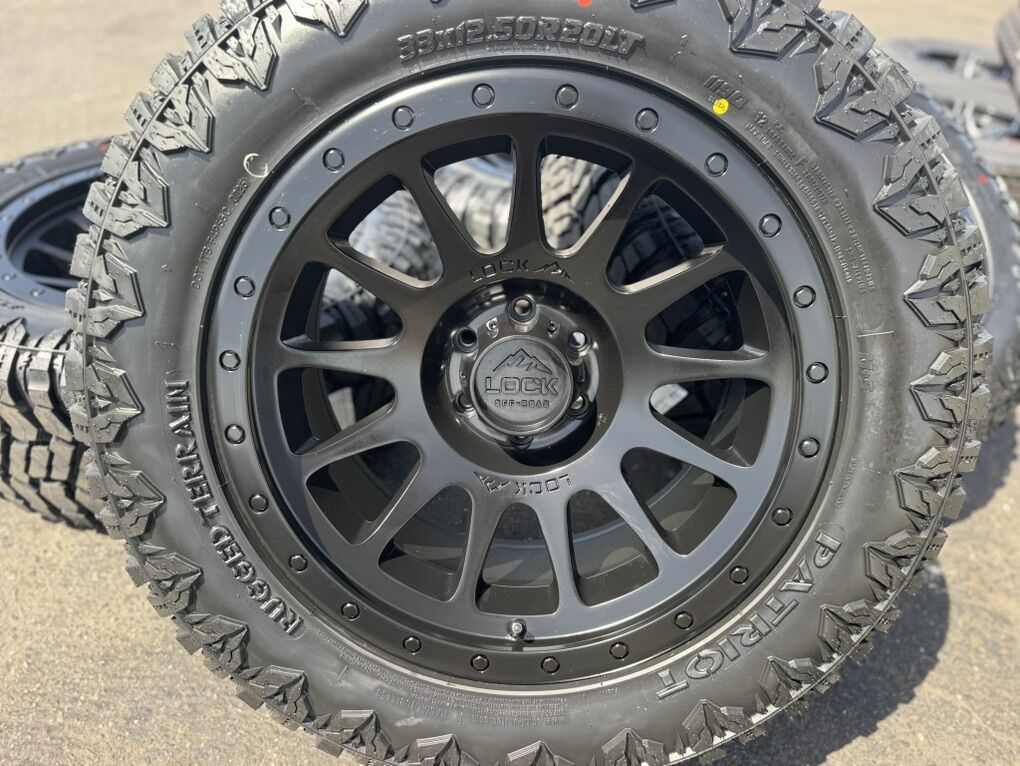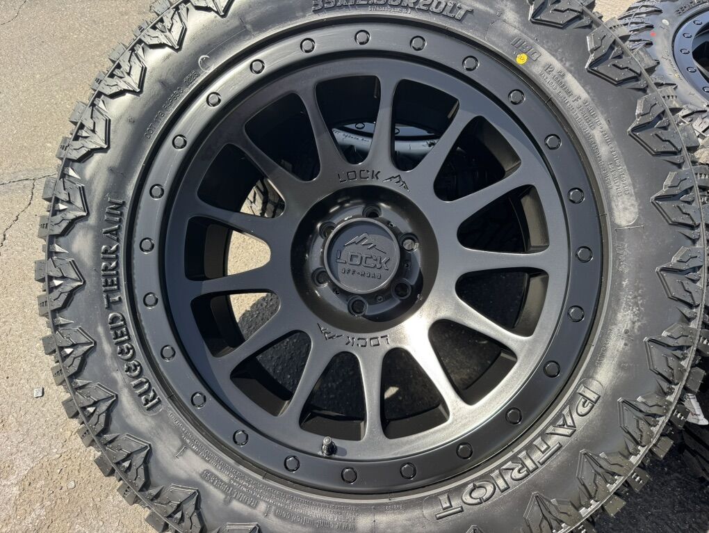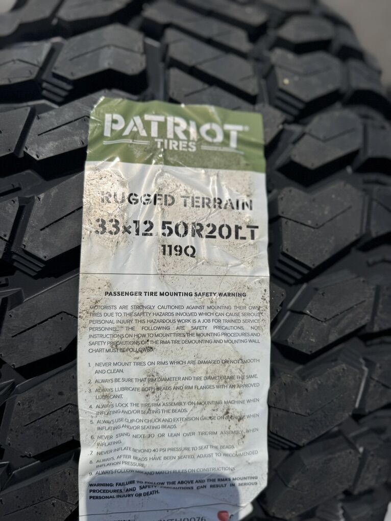 Brand new wheels and tires. Stickers still on everything, never mounted to a truck. Tires are Patriot RT 33x12.50x20 12 ply Load Range F.
