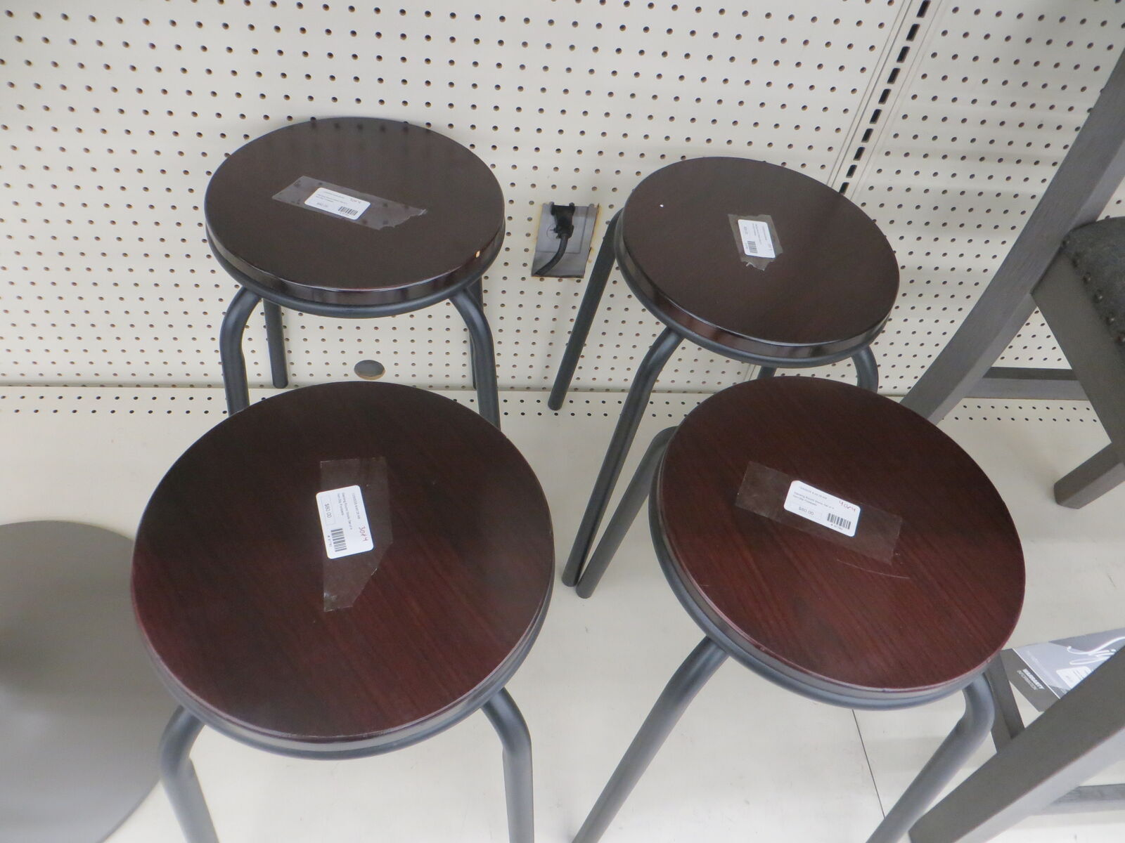 We have one Stacking Round Stools, Set of 4, Non Slip Footpads, Wood Seat #97782 available. This set of barstools is New and comes assembled out of box.