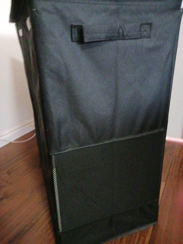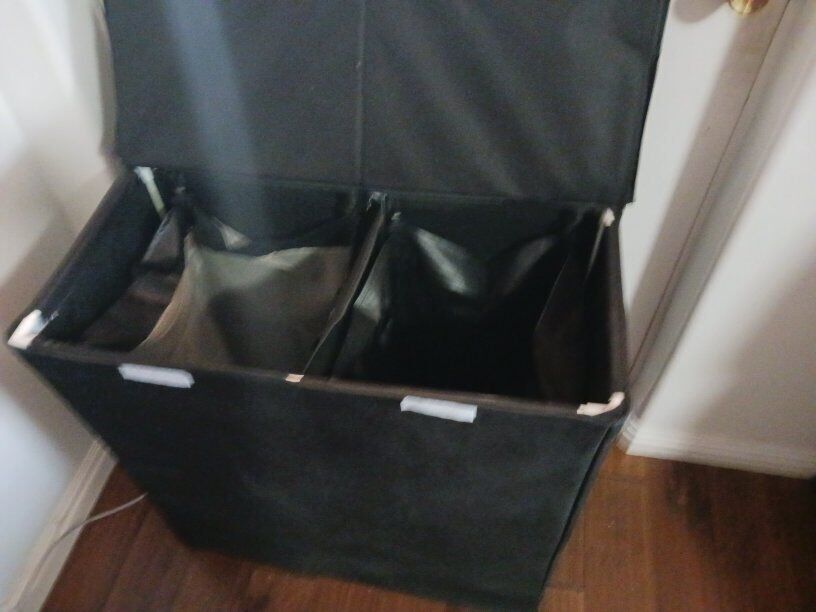Venmo24 inches wide by 15 inches deep 27 inches tall. Dual side clothes hamper with removable liners, mesh siding for breathability. Top velcros to open or can take completely off. sturdy handles for carrying.