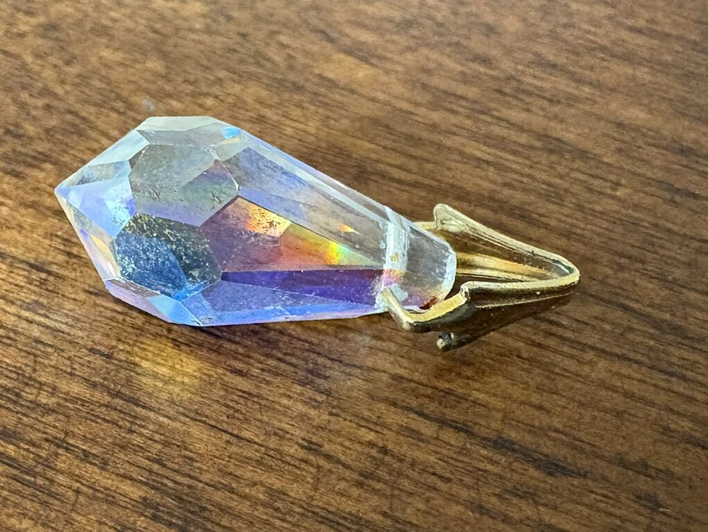 I have a vintage crystal teardrop pendant with a gold tone metal hanger. It is clear but has rainbow iridescent color. It looks like a Swarovski but I don’t know that for sure. It is about 7/8 inches long. See my other ads for jewelry, artwork, home decor and more.