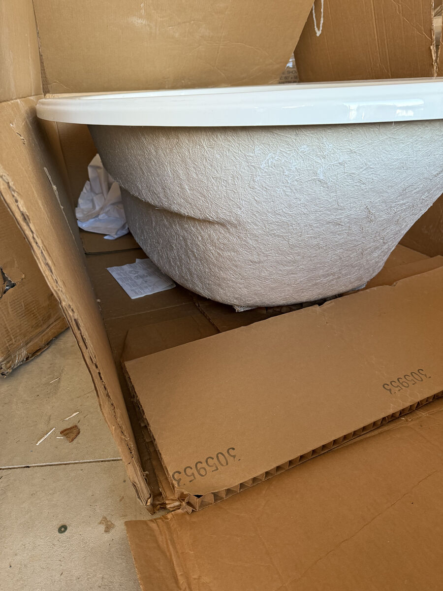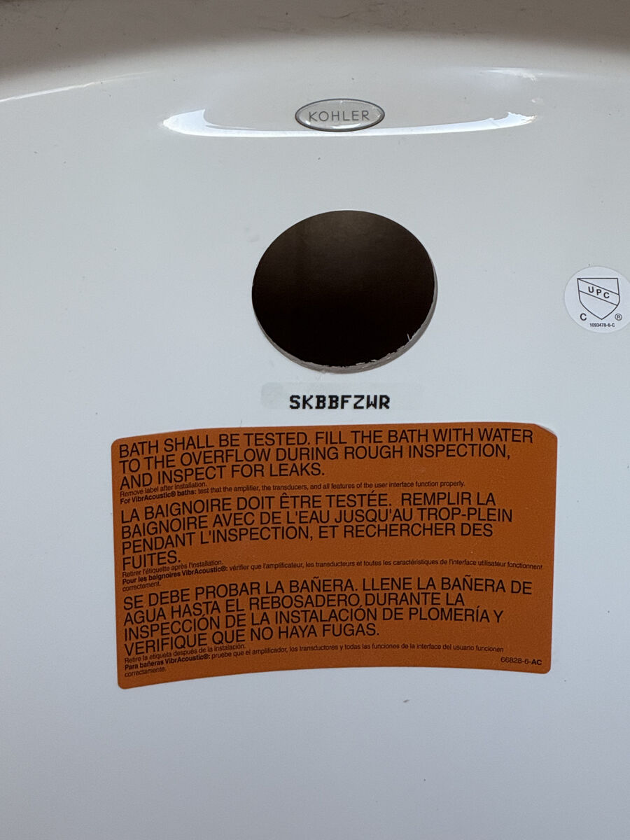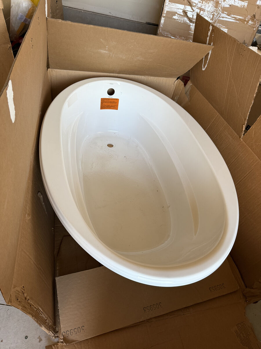 Sleek, spacious, and never installed. This white acrylic KOHLER tub offers a luxurious oval shape with molded lumbar support and armrests for ultimate comfort.