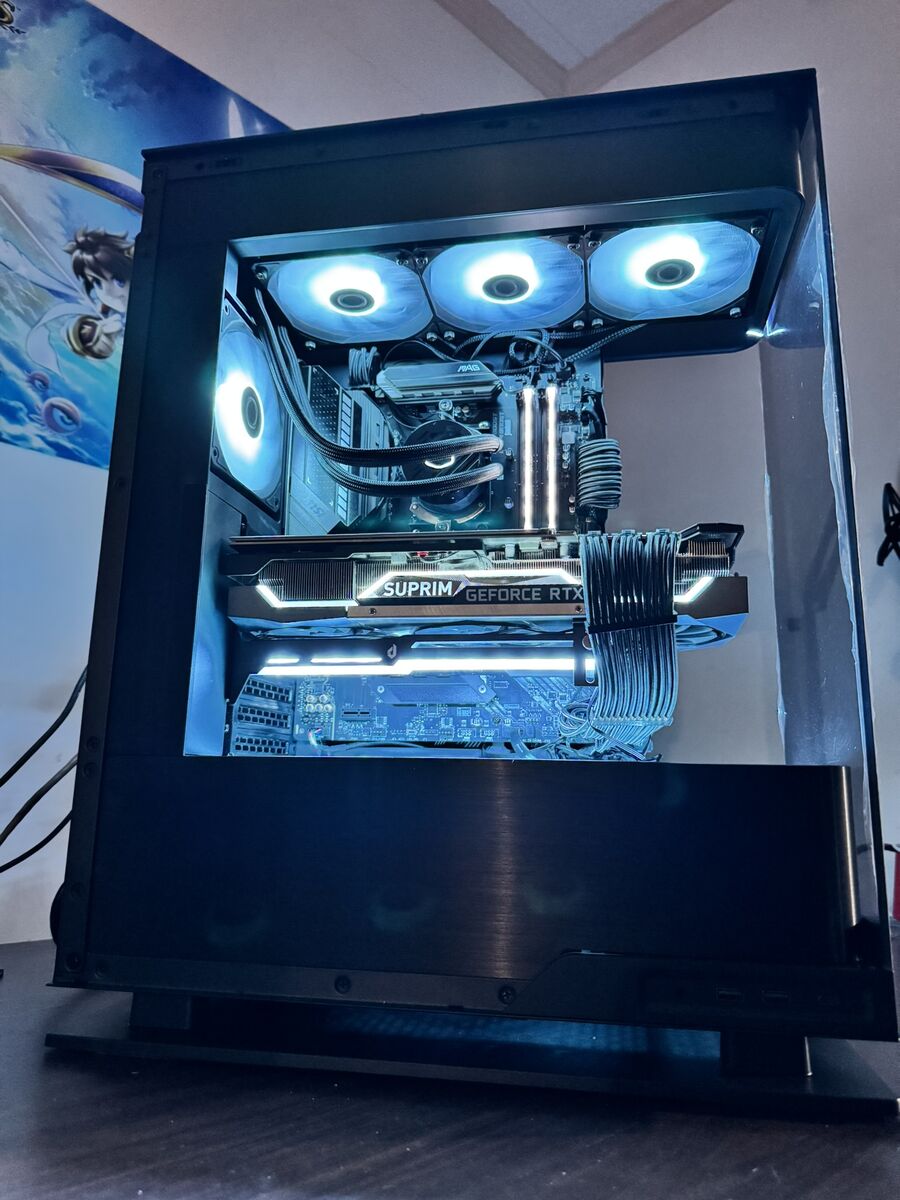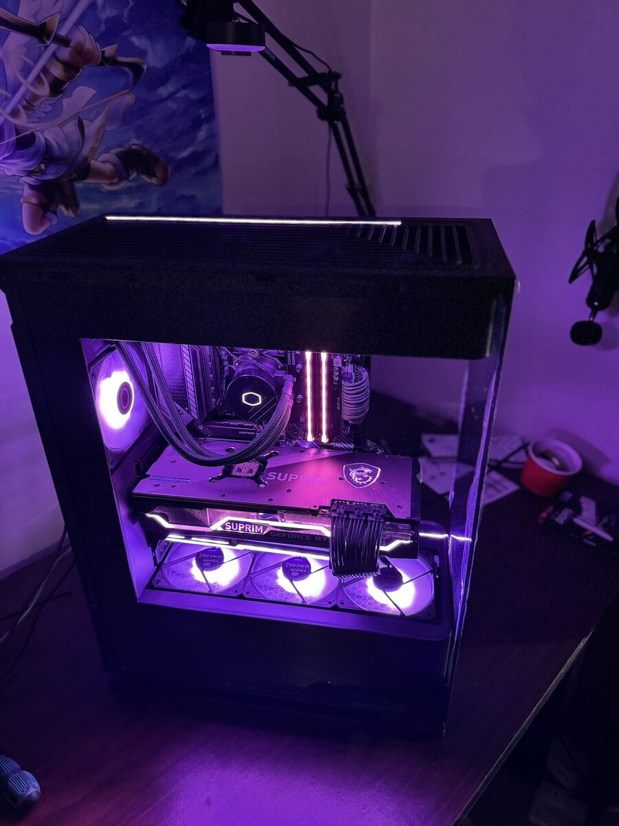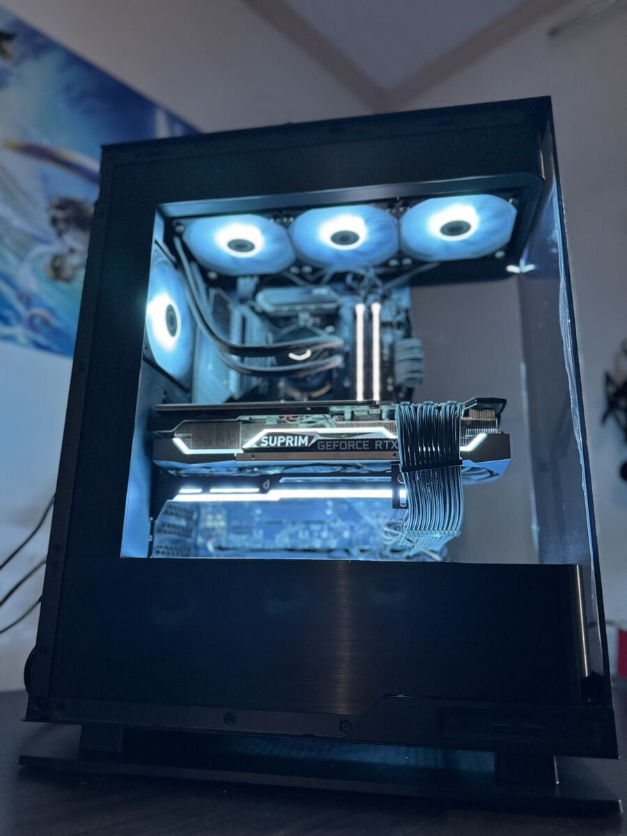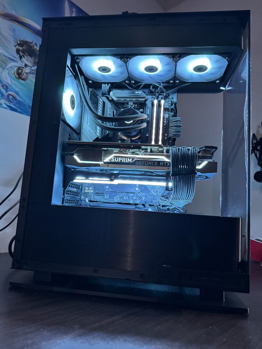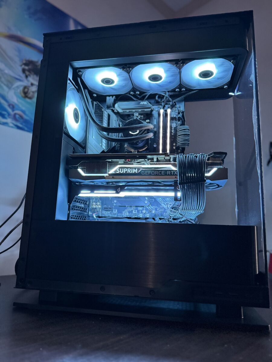 Love this build! The aesthetics are full blast whether you want a single color (like me) or Rainbow RGB overload, this computer will satisfy your ideal image of a computer. This case specifically was very cool to work on and it looks great! I might try this case again soon tbh. Another point of interest is the size of the graphic card; it has a lot of cooler space for all 3 fans and heat syncs on its mammoth body.
