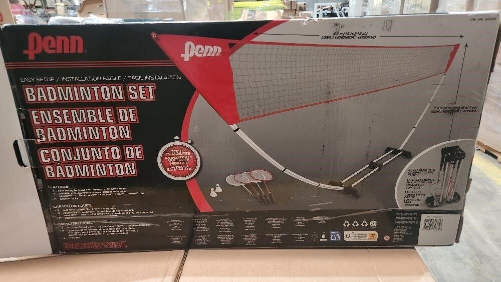 Premium Easy Setup Badminton Set by Penn; Quick and easy setup; Durable steel base and extendable poles; Patent-pending design doubles as compact carry caddy; Includes 4 official-size one-piece badminton rackets with premium cushioned grips; Includes 2 shuttlecocks; Net height 5 ft. 1 in. (1.5 m), length 15 ft. (4.5 m); Net Dimensions: 15' W 14 L 61 H; Weight: 7.05 lbs; Ideal for backyards, parks, and beaches.