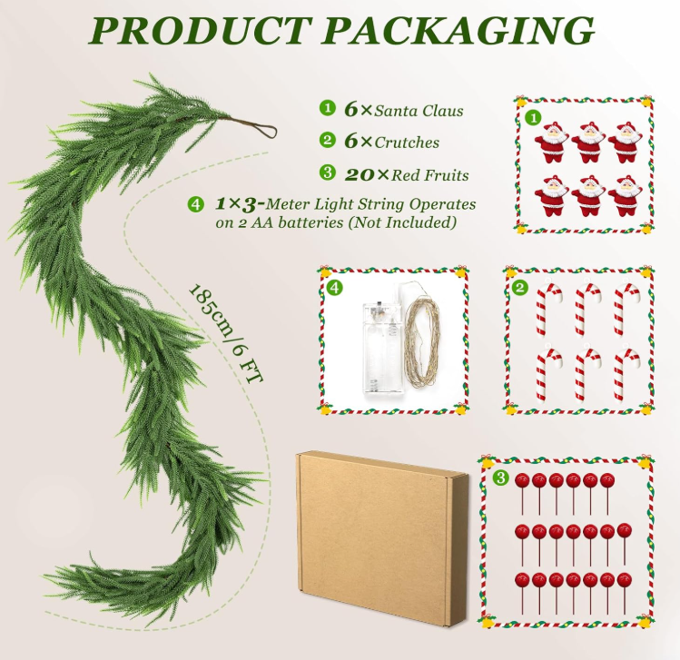 ZellePremium-Quality Materials: Crafted from premium PVC and hypoallergenic materials, this 9-foot norfolk pine garland offers generous coverage with its ideal length. It comes with abundant decorations: 6 Santa Claus ornaments, 20 red berry ornaments, 6 candy cane ornaments, and 13 pieces of iron wire. Combine multiple wreaths for an even fuller, lusher holiday display