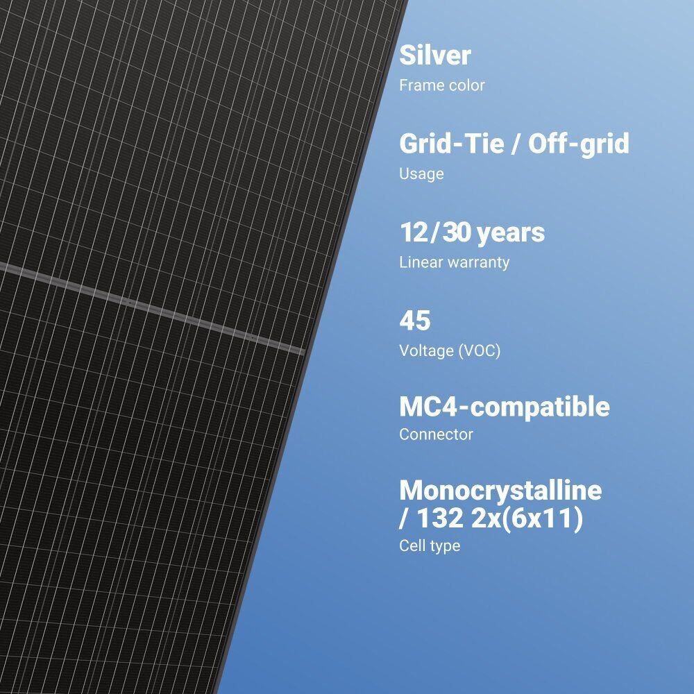 Specification: Length 79.06in Width 39.45in Rated Power Output 385 W Voltage (VOC) 48.4V Maximum String Voltage 1500V Number of cells 72 Cell Type Monocrystalline Rated Efficiency 19.13% Connector Type MC4 Backsheet Color Black Frame Color Black Dimensions LxWxH 79.06 x 39.45 x 1.57 in (49.6 lbs each) Pallet Qty 27 Manufacturer Jinko Solar Manufacturer Part # JKM385M-72HBL-V_R (144 split cells) Operating Temperatures −40°F to +185°F Scope of Application Solar Panels for Boats Solar Panels for Home Solar Panels for RV Use Grid-Tie Off-Grid Warranty 25-YEAR LINEAR WARRANTY 144 PERC Half-Cell Mono Solar Panel. 1500VDC. 40mm black frame, black backsheet. NYSE-listed since 2010, Bloomberg Tier 1 manufacturer Top performance in the strictest 3rd party labs
