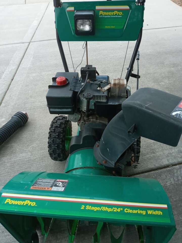 MTD PowerPro 8hp 24" width gas snow blower with electric start. Starts right up and runs great. 801-441-8632 $275 or best offer.