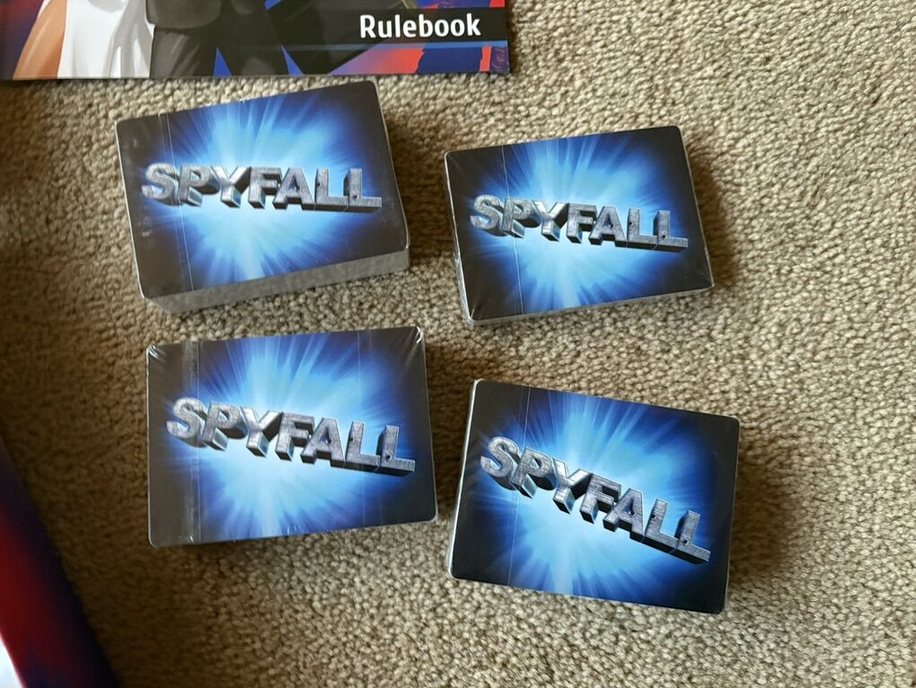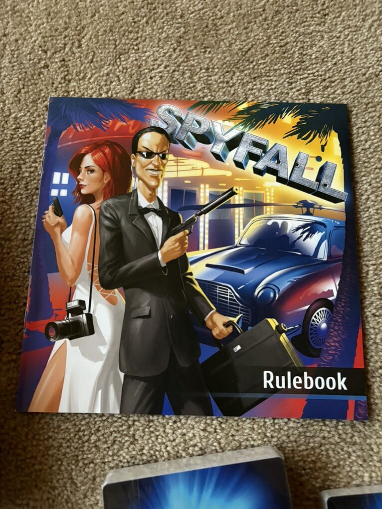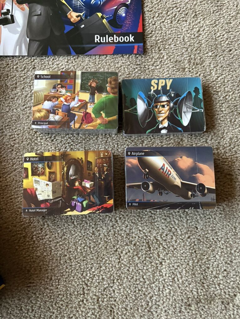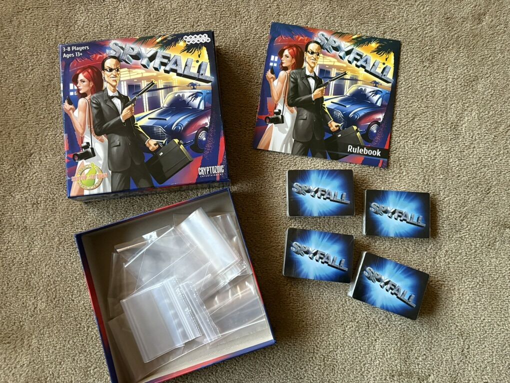 NEW (open box, sealed components) Spyfall Game. A psychological card game by Alexander Ushan, Hobby World, Cryptozoic, 2015. 3-8 players, ages 13+. Components in new, unplayed condition. Box corners slightly worn, small hole in bottom of box. Text only. Cash or Venmo.
