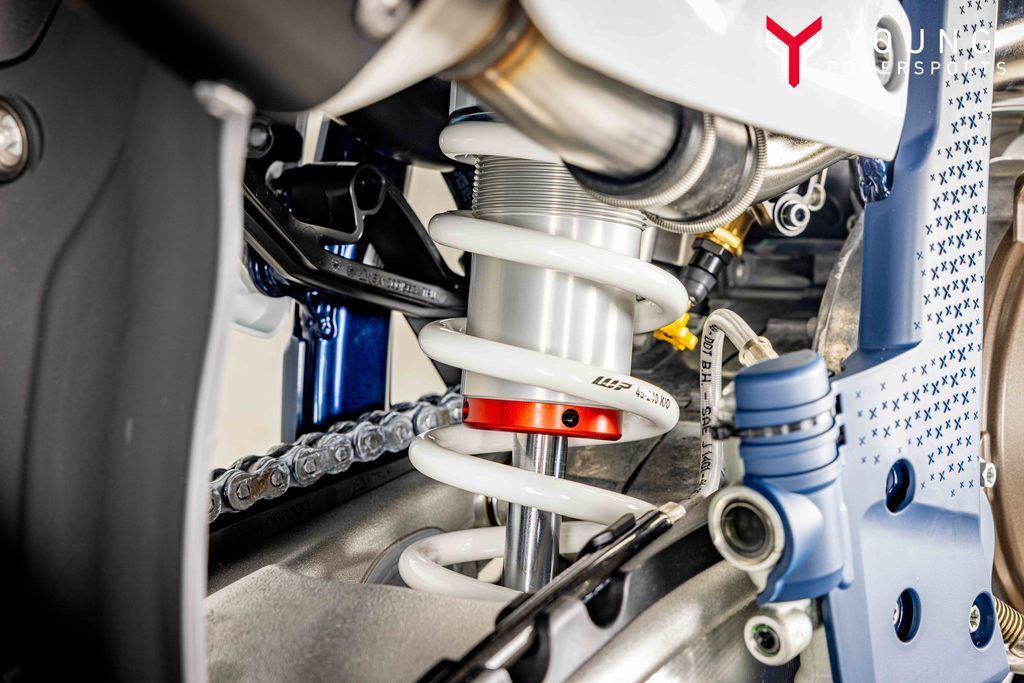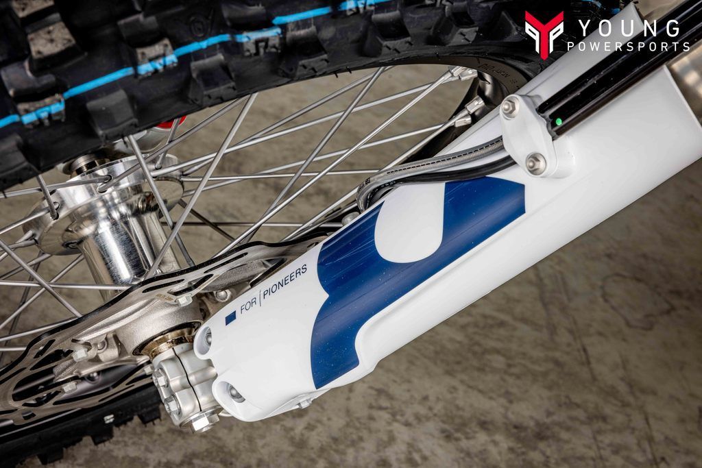 With an optimised distribution of material around the steering head and upper shock mount, the frame delivers confidence-inspiring handling and assured stability when entering corners. To complement the overall look of the machine, the chromium molybdenum chassis is finished with a premium, metallic blue powder coating. The finishing touches are the frame protectors, which not only protect the paintwork, but also provide riders with additional grip, even in the toughest conditions.