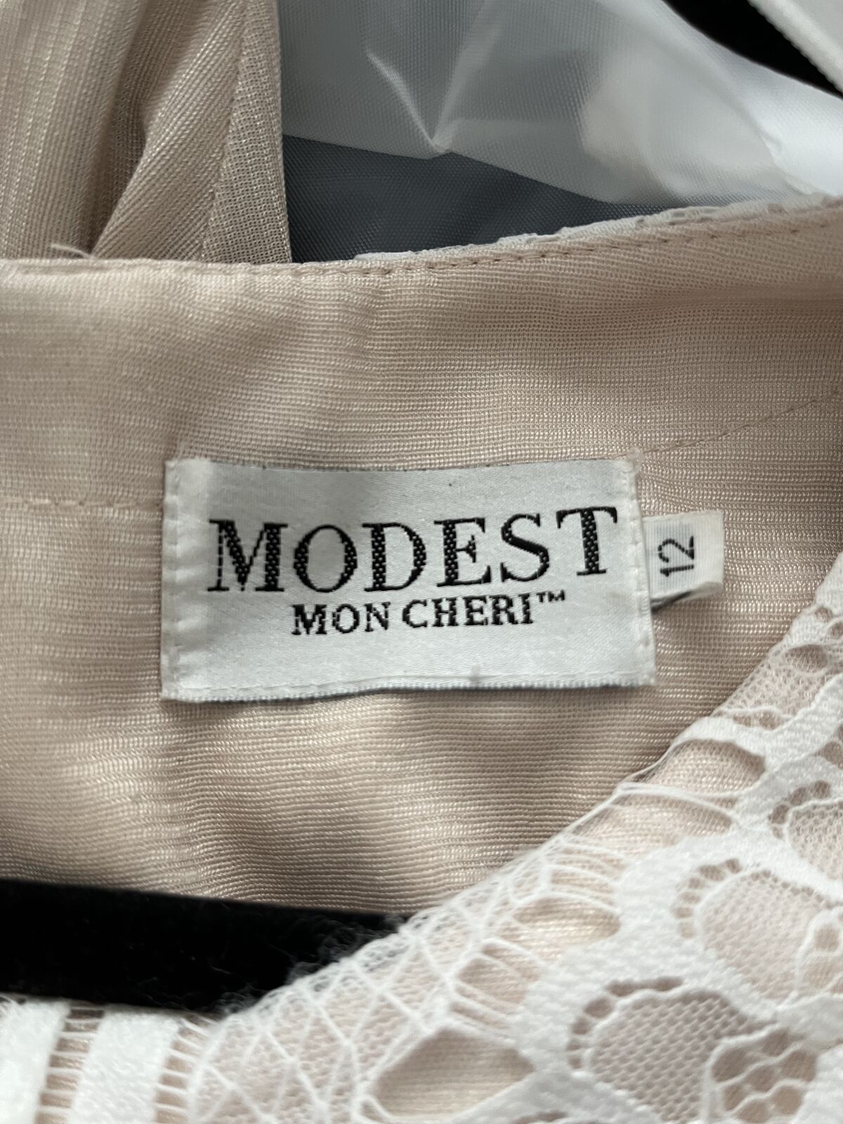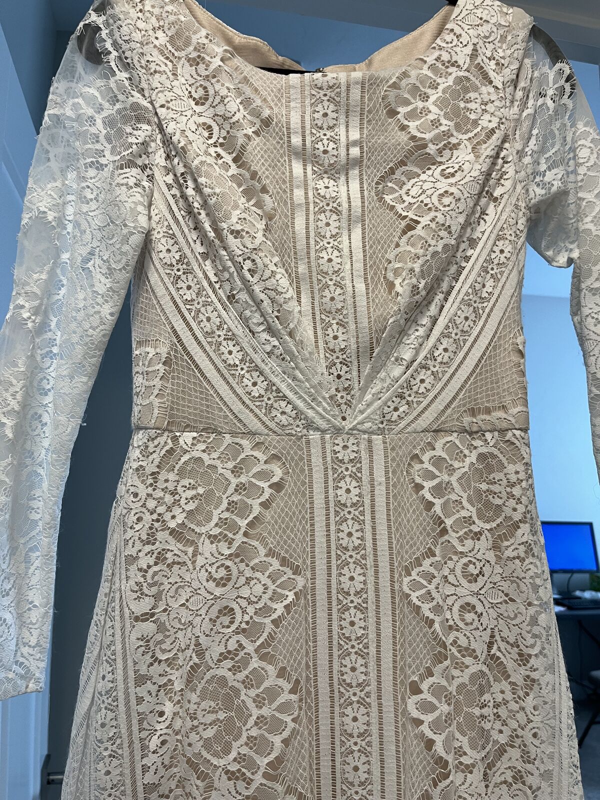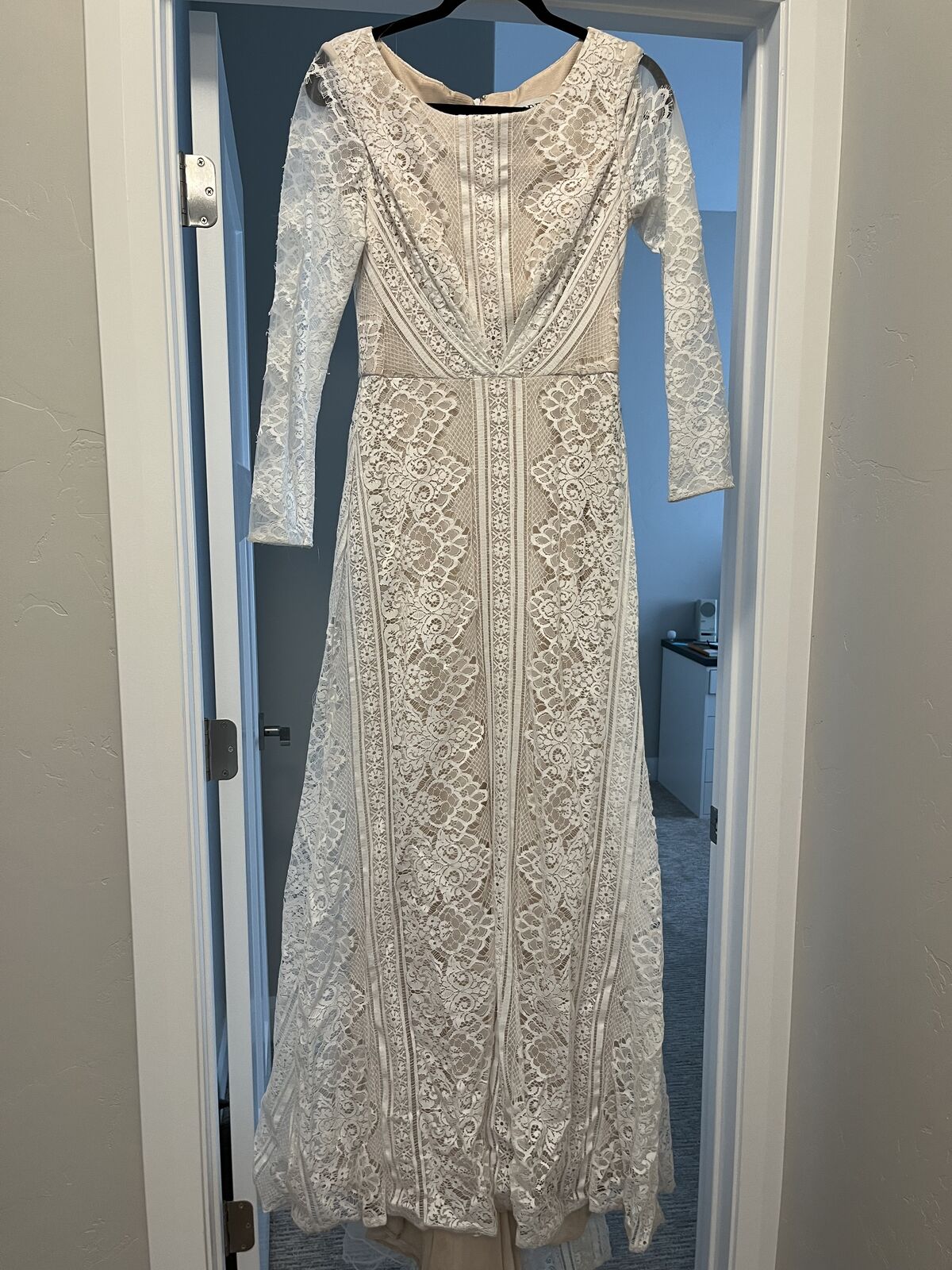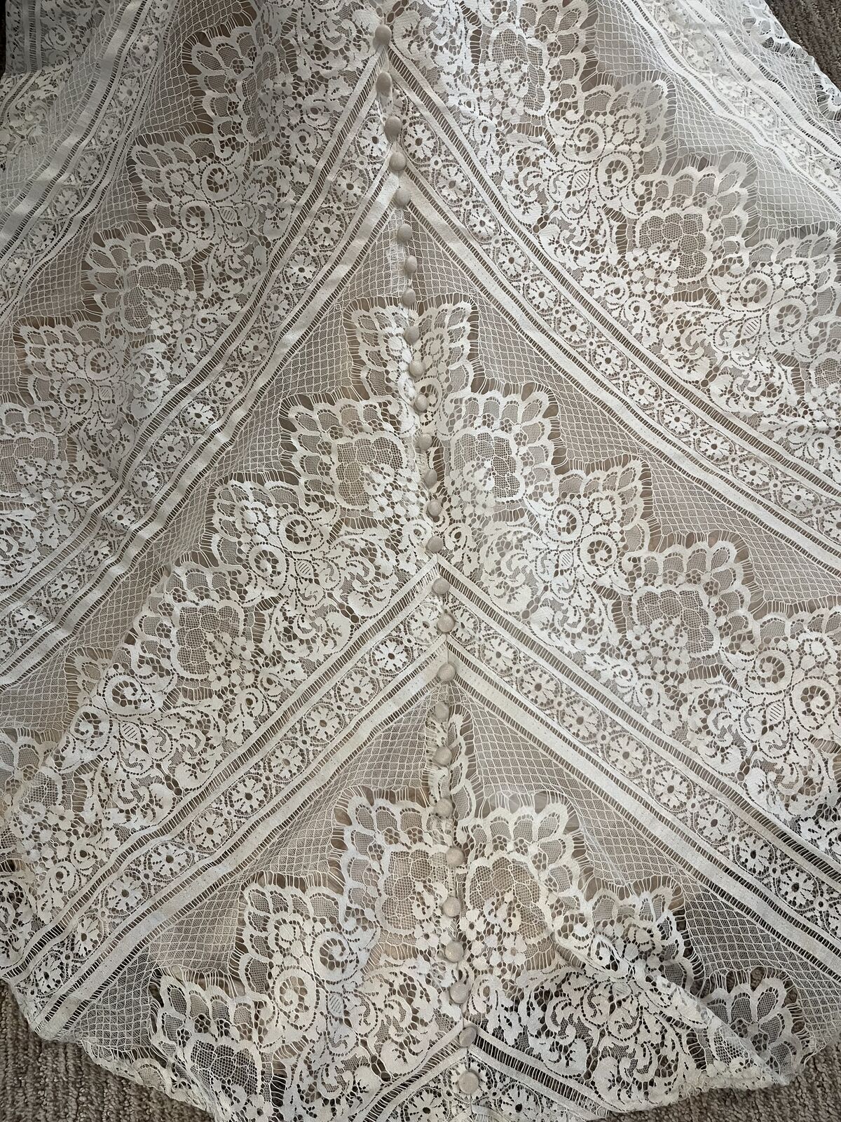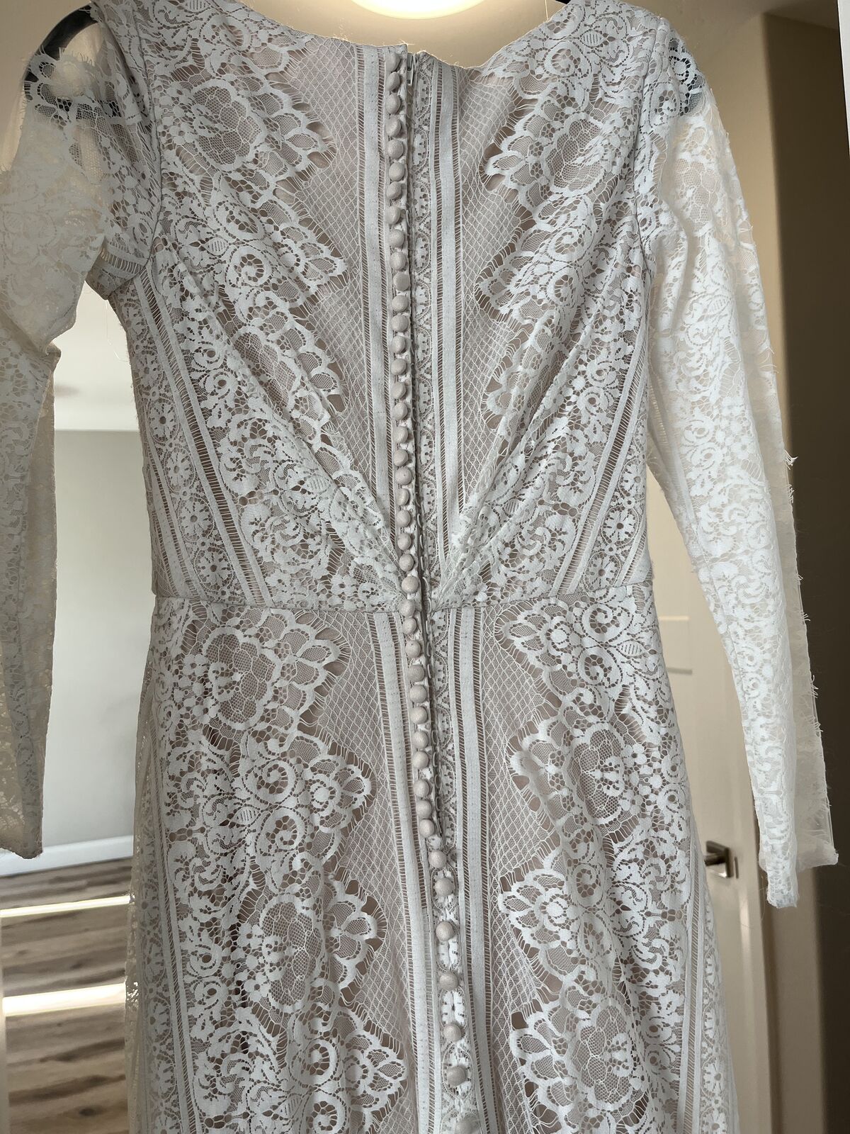 VenmoWhite lace over champagne. Train with covered buttons from neckline. Long sleeved size. 12.