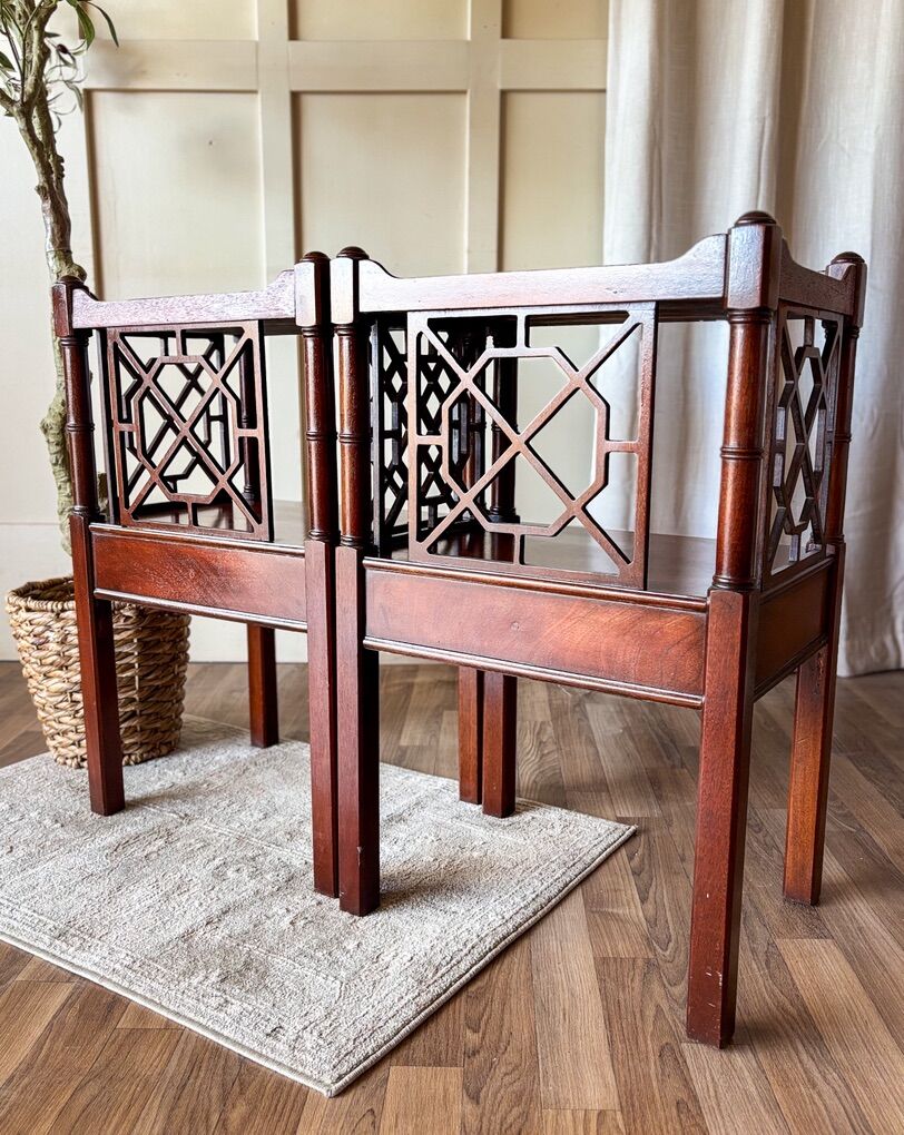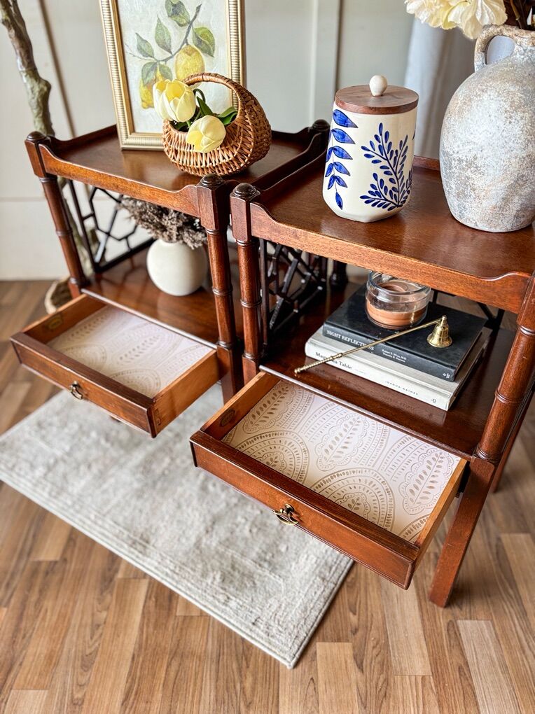 VenmoThese charming two tier side tables or nightstands feature intricate openwork panels, two spacious shelves, and a smooth gliding dovetailed drawer with its original brass hardware, making them both beautiful and functional. Each drawer is wallpaper lined for a clean and elevated finish, and the wood slide works effortlessly. Sturdy, well maintained, and showing only minor wear consistent with age, they are likely from the 1960s to 1970s and crafted in the United States in a style influenced by Chippendale and Asian inspired design. These pieces offer a perfect blend of elegance, warmth, and practicality for any room!