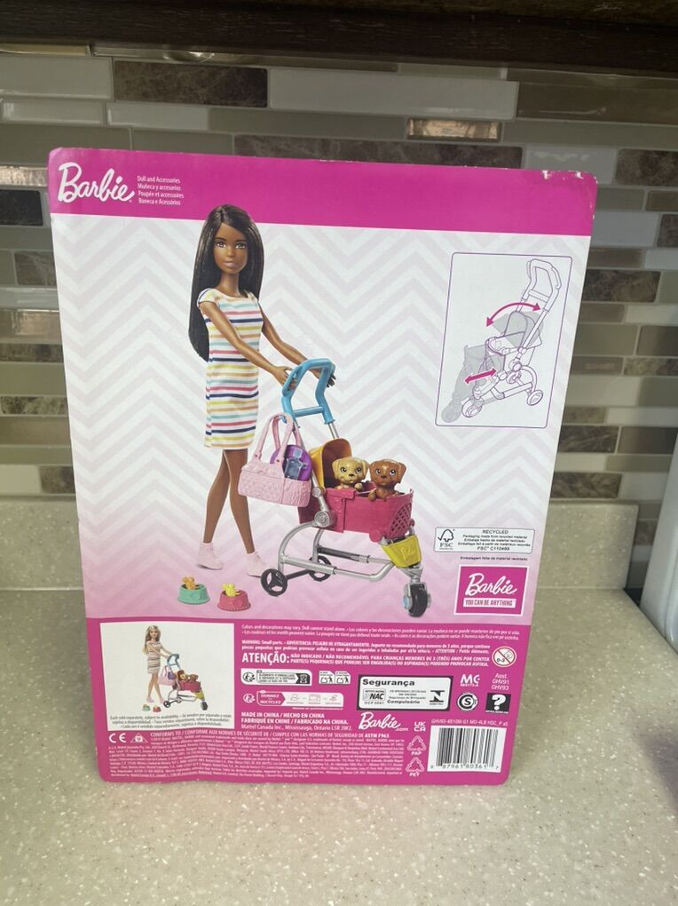 VenmoBarbie Stroll 'n Play Pups Playset. This toy set includes a Barbie doll, a transforming stroller, two puppies, and various accessories.