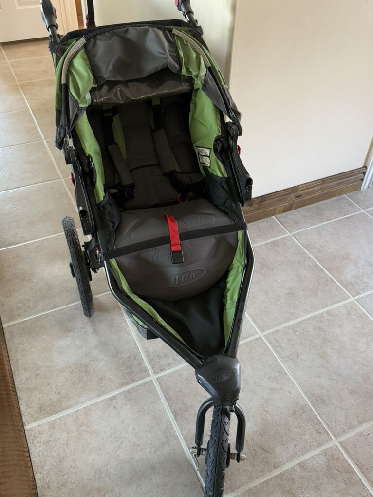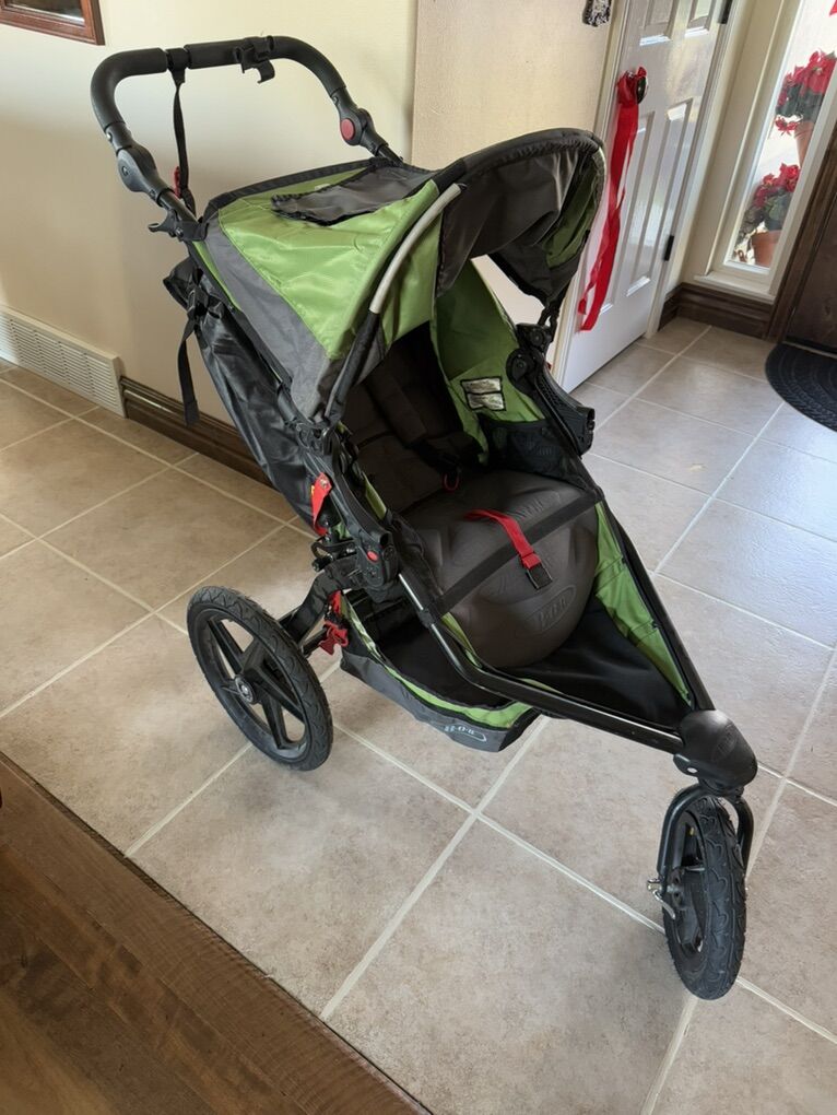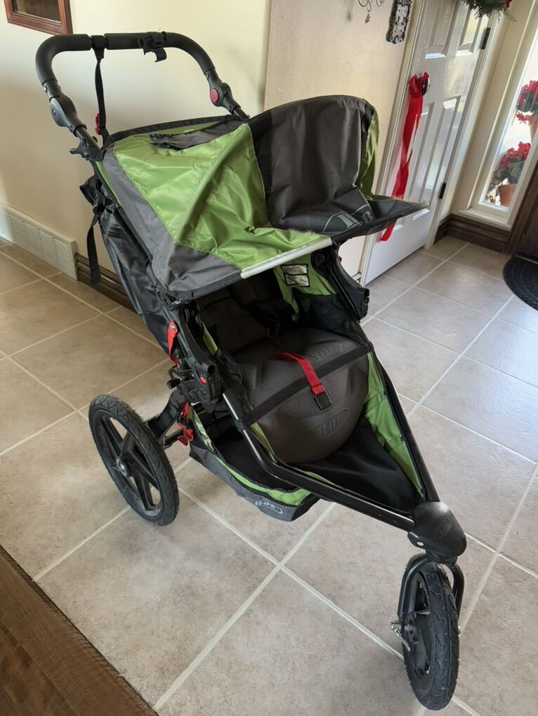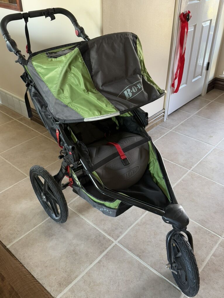 B.O.B jogging stroller folds up great BOB it does have flat tires.