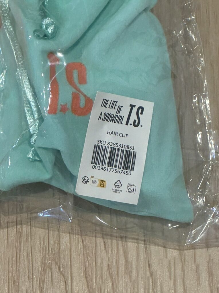 Official merch from the Taylor Swift website and it is completely sold out! Never been opened and completely sealed. Mint green pearlescent hair clip featuring The Life of a Showgirl album logo in orange sparkle printed on side of clip.