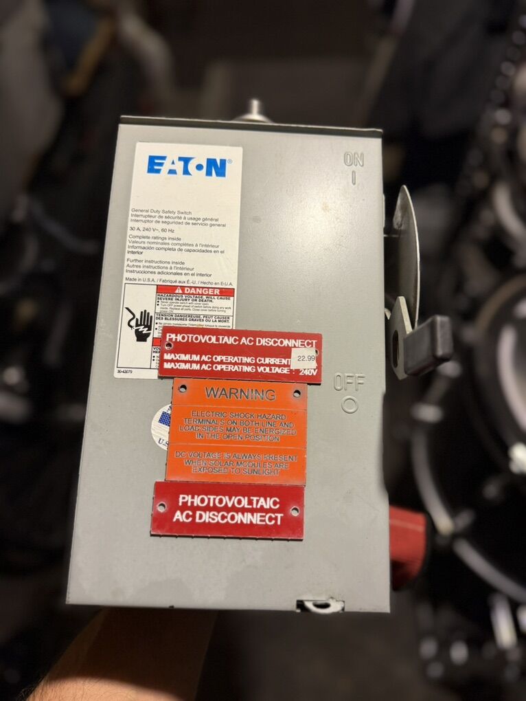 ApplePayEaton photovoltaic AC disconnect, removed from a fully working solar installation during a Tesla Powerwall upgrade. Used – Good condition with normal cosmetic wear. Originally installed in 2021.