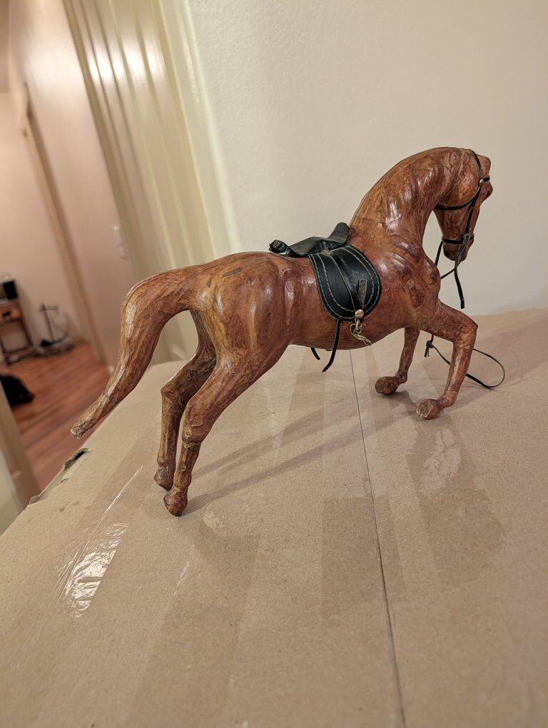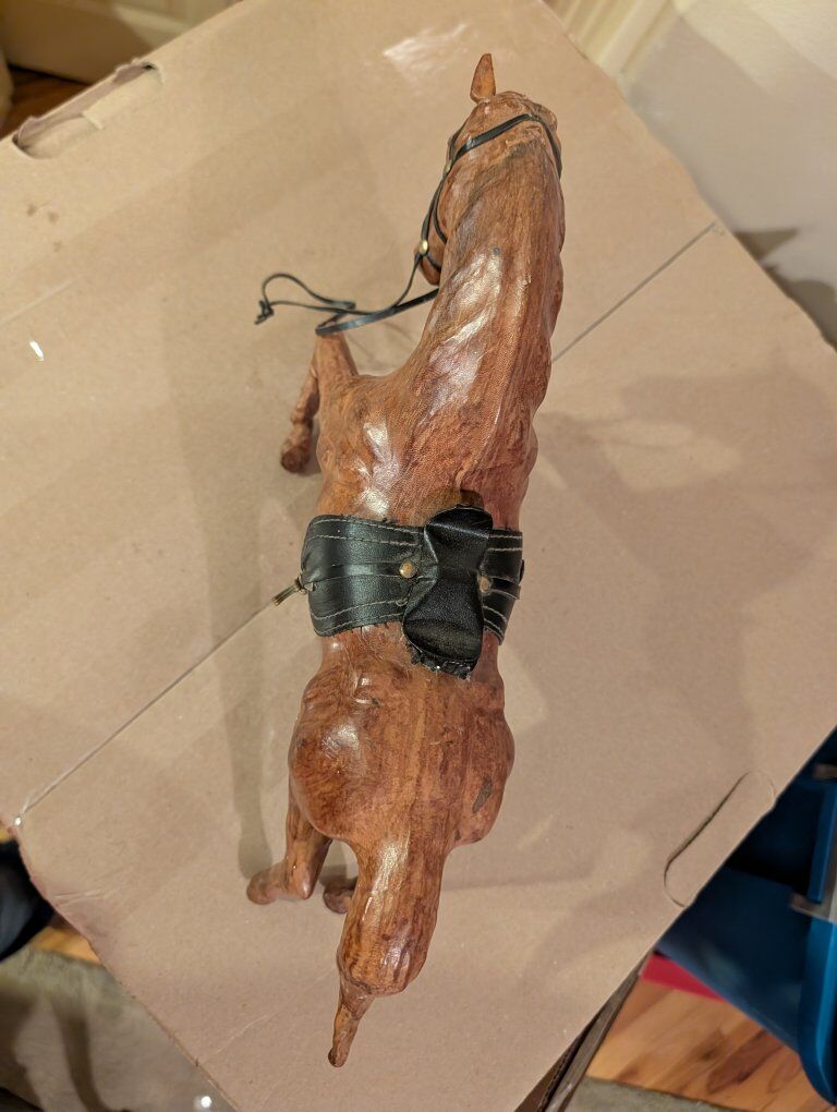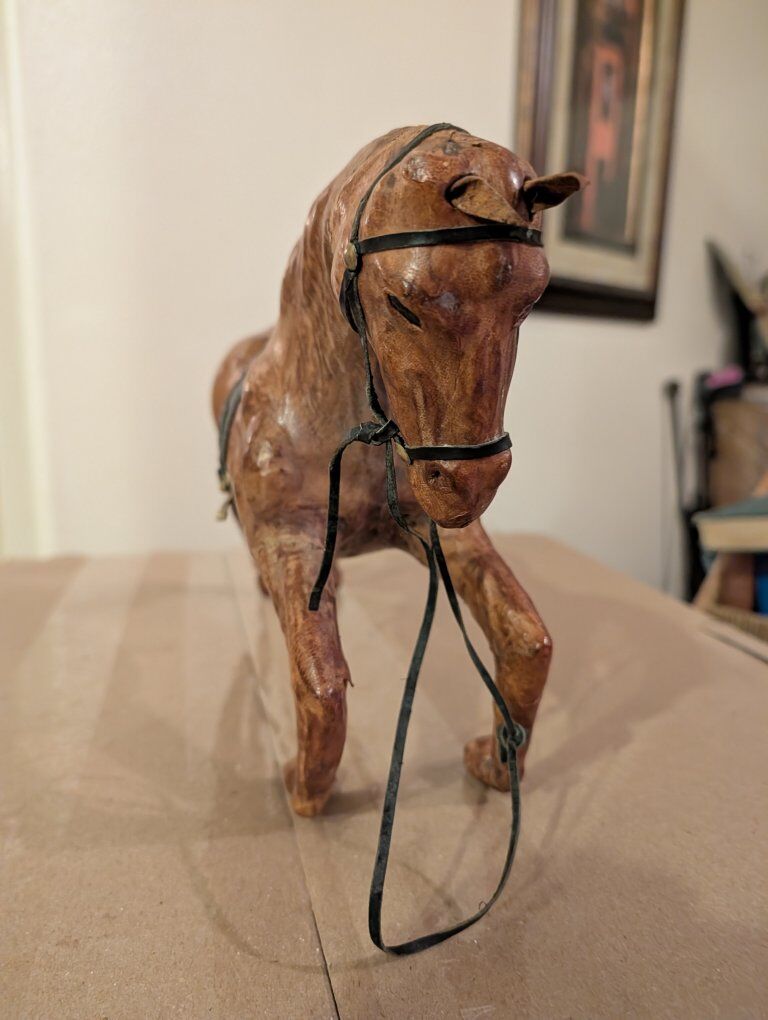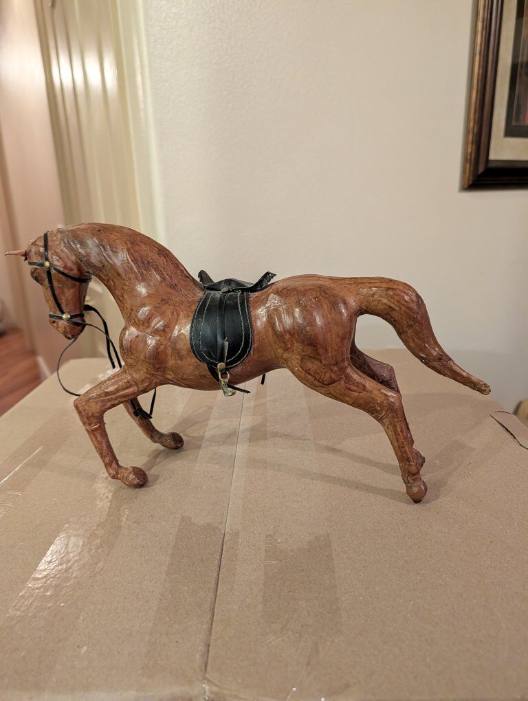 VenmoA vintage beautiful leather wrapped horse. If you look at the belly, on one of the pictures. you'll see one of the straps isn't connected.