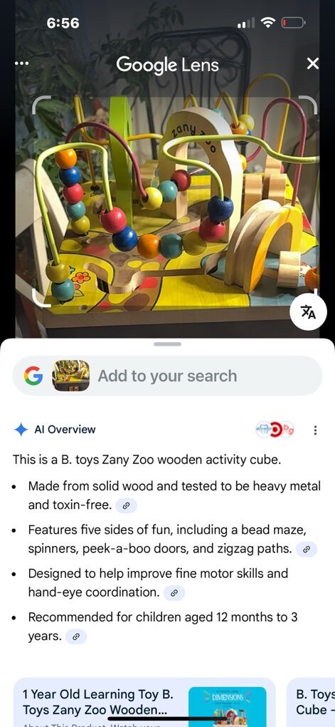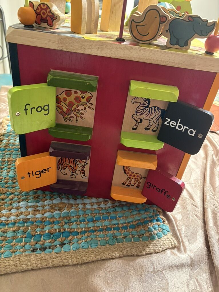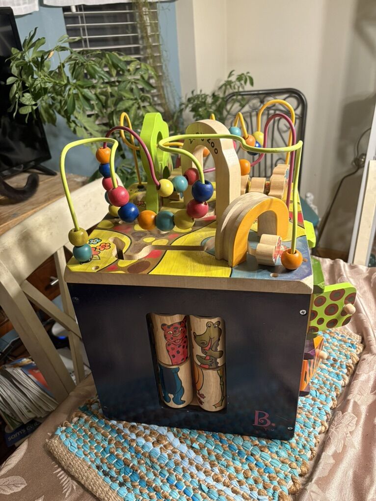 VenmoSolid wood and toxin free metal, 5 sides of fun ,bead maze ,peak a boo doors etc…recommended for kids 1 yr to 3 years of age helps with hand , eye coordination $50 or best offer