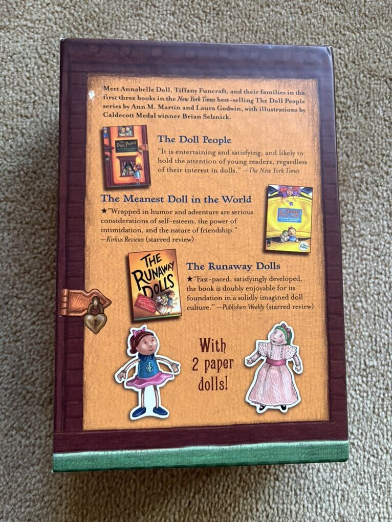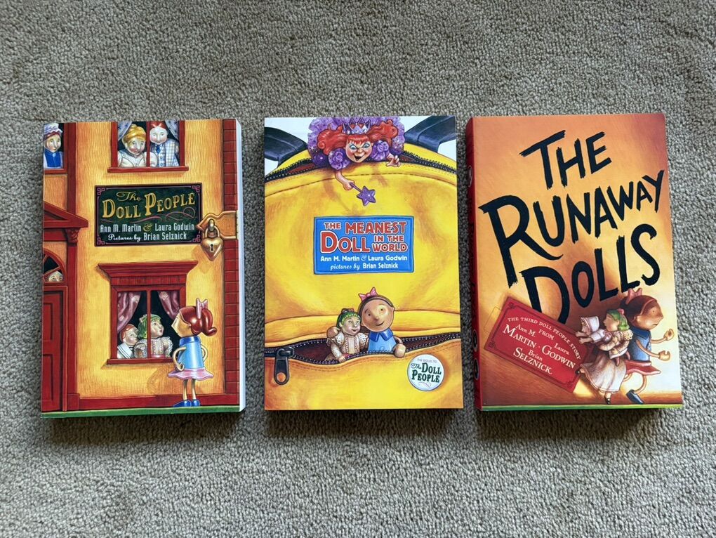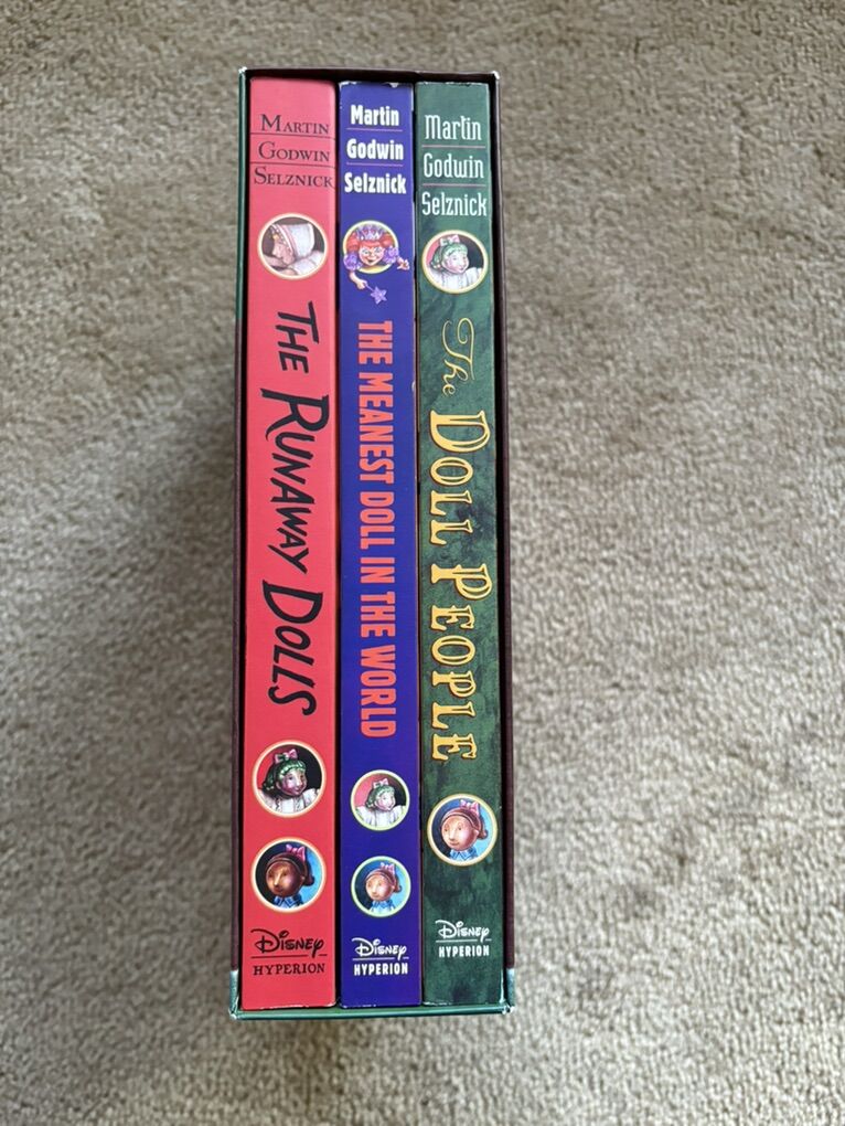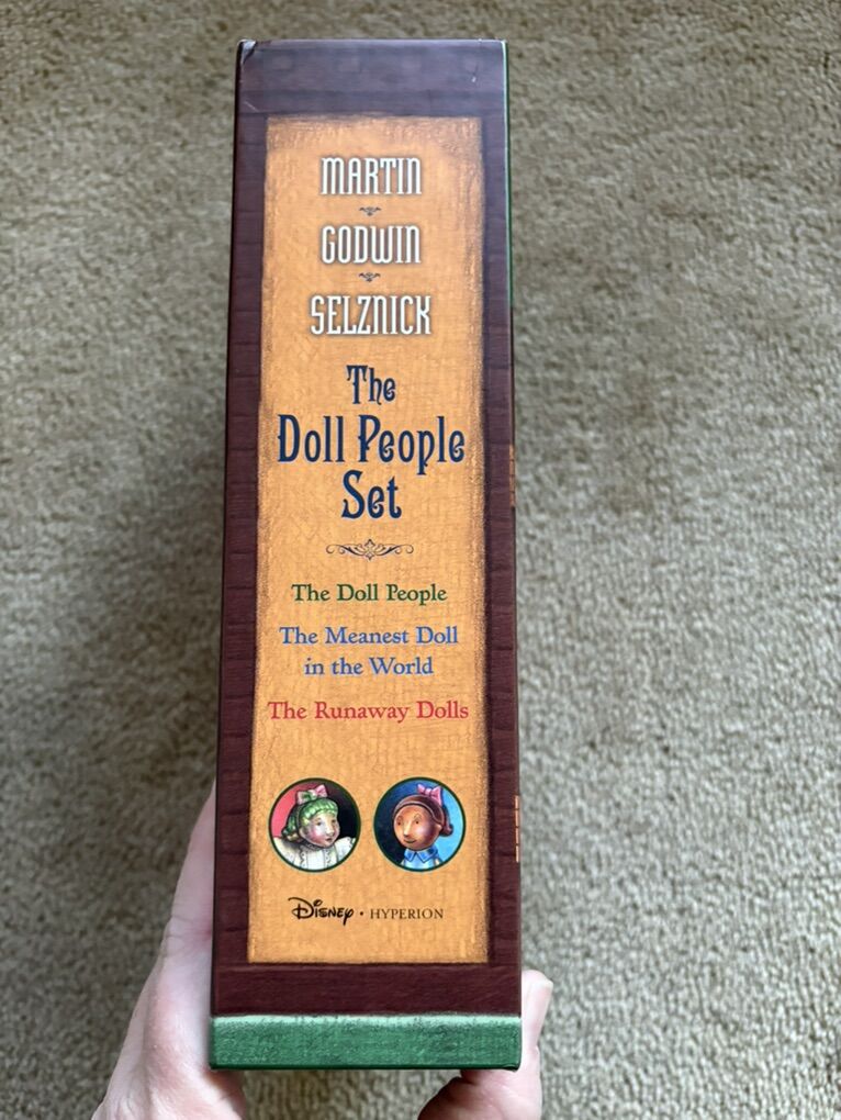 The Doll People Boxed Set, by Ann M. Martin & Laura Godwin, illustrated by Brian Selznik: The Doll People, The Meanest Doll in the World, and The Runaway Dolls. Oversized paperbacks in a sturdy box. (Missing paper dolls.) Disney Hyperion, 2000, 2003, 2008. Ages 8-10 years. Very good condition. Text only. Cash or Venmo. Discount on multiple items.