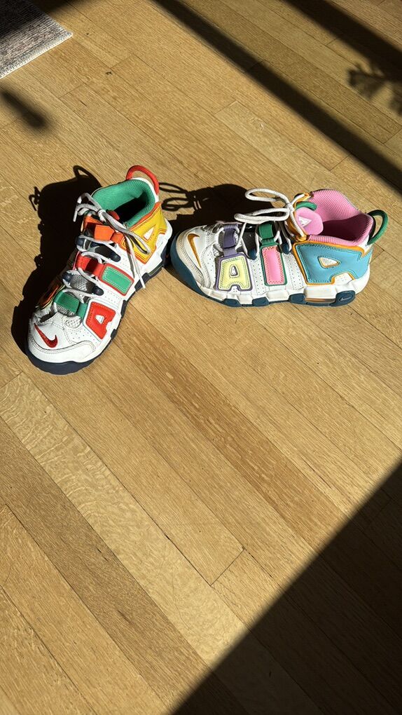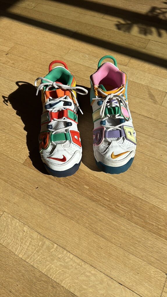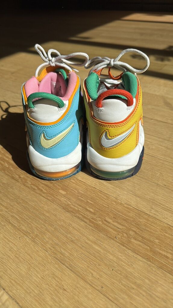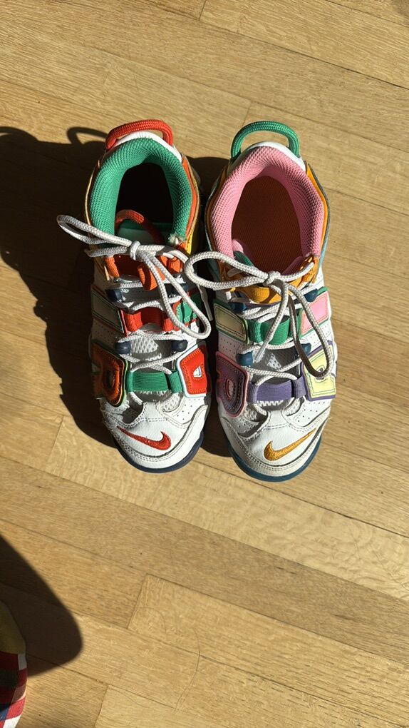 VenmoThe Nike Air More Uptempo BG What The Multi-Color sneakers in size 4Y feature a mid-top shoe shaft style with a round toe shape and lace-up closure. Made with leather upper material and a foam insole for comfort, these athletic shoes are designed for basketball performance and activity. The colorful multicolor design with logo accents makes them a stylish choice for unisex kids, suitable for the summer, fall, and spring seasons. With a rubber outsole for durability, these Nike Air More Uptempo sneakers offer cushioned support and adjustable features for active young individuals.