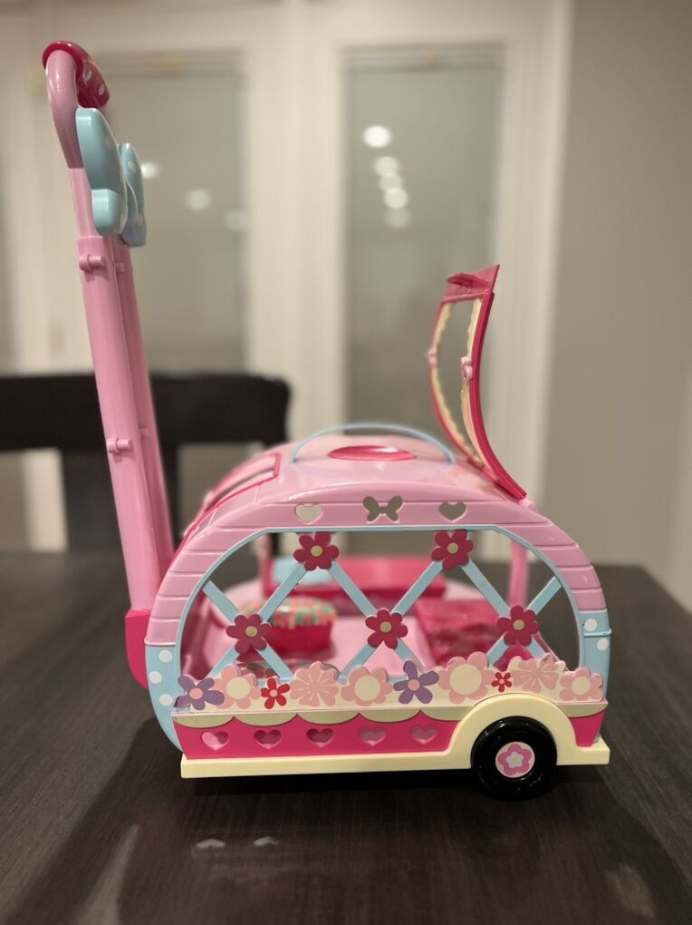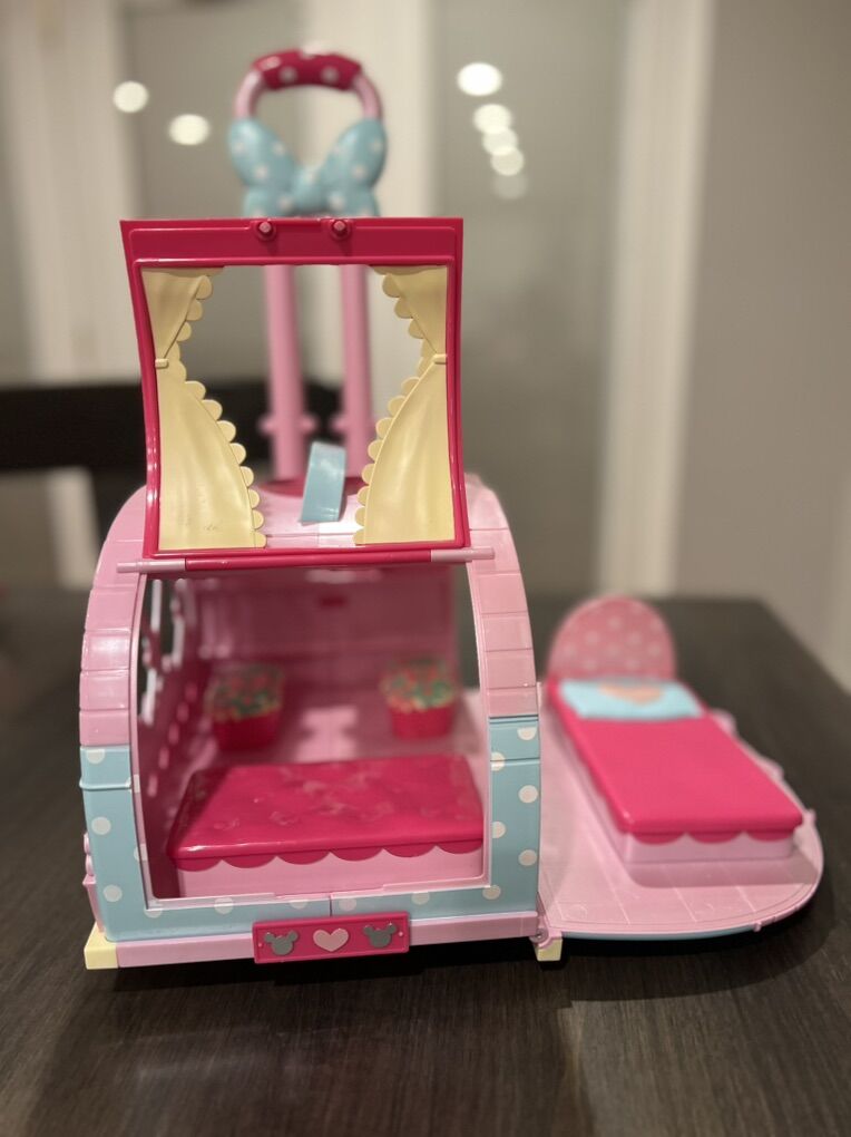 Cute Minnie Mouse Camper in good condition. Has wheels and a tag along handle. Side and back can open for easy access to the inside.