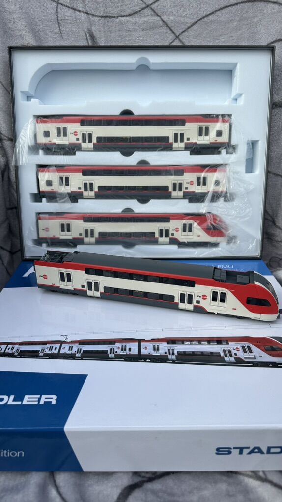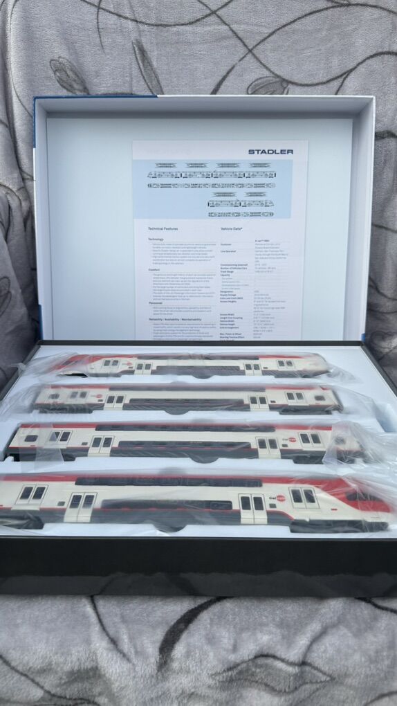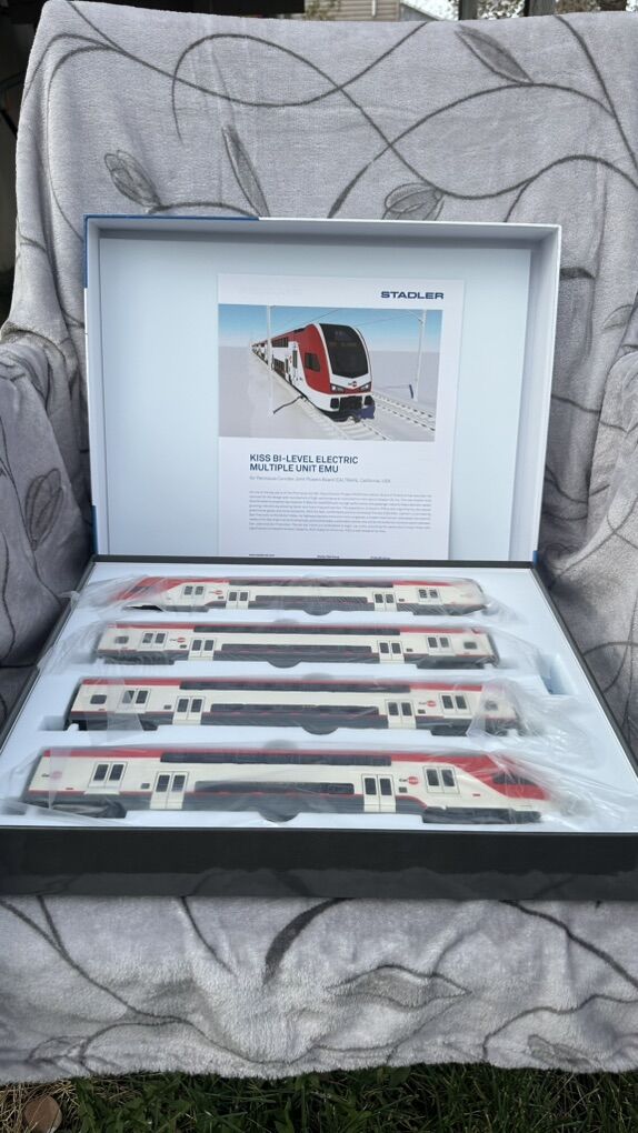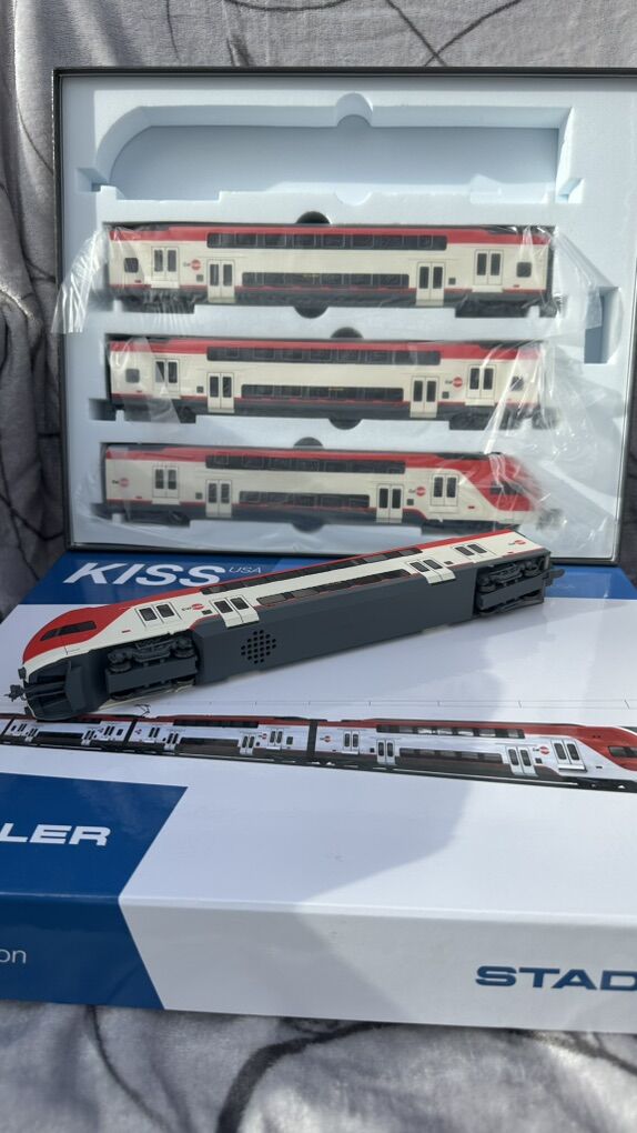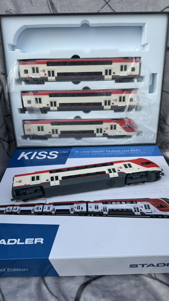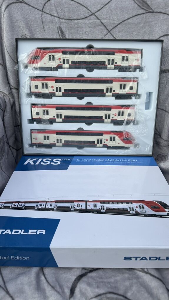 ZelleHO Scale Stadler KISS EMU Electric Train Model 1:87 - Caltrain 4-Car Set Own a Piece of Modern California Railroad History! This meticulously crafted HO scale (1:87) model brings the future of Bay Area transit to your collection—the revolutionary Stadler KISS Electric Multiple Unit (EMU) in the iconic Caltrain livery. Witness the dramatic transformation of the Peninsula Corridor with this accurate replica of the trains that replaced diesel locomotives, connecting San Francisco to Silicon Valley with clean, efficient, and high-performance service. --- Key Features of This Caltrain Model: · Official Caltrain Livery: Faithfully reproduced in the official white and red Caltrain scheme with accurate logos and markings. · Precision HO Scale (1:87): Perfectly compatible with all standard HO scale layouts, tracks, and accessories. A great addition to layouts depicting modern California or urban commuter scenes. · Exquisite Detail: Features intricate bodywork, detailed undercarriage, fine separate parts like handrails, and realistic pantographs. The bi-level design is captured with stunning accuracy. · Electric Multiple Unit (EMU): Represents Caltrain's historic shift to electrification—a must-have for modelers focusing on modern, sustainable railroading. · Impressive Presence: The complete 4-car set measures approximately 48 inches (122 cm) long, making it a striking centerpiece for any layout or display. · Prototypical Accuracy: Modeled directly from the real Stadler KISS trainsets used by Caltrain since their entry into service, perfect for era-specific layouts (2020s–present). --- The Prototype: Caltrain's Stadler KISS EMU This model represents the real-life Stadler KISS trainsets that form the backbone of Caltrain's Peninsula Corridor Electrification Project (PCEP). These electric trains enable: · Faster and more frequent service between San Francisco and San Jose · Reduced greenhouse gas emissions and noise pollution · Increased passenger capacity with bi-level comfort · A modernized commute experience for Silicon Valley and Bay Area residents --- Ideal For: · Collectors of modern American commuter trains · Model railroaders building contemporary California layouts · Fans of Stadler rolling stock and electric trains · Anyone seeking a highly detailed, ready-to-display model --- Product Specifications: · Scale: HO (1:87) · Railroad: Caltrain (Peninsula Corridor Joint Powers Board) · Model Type: Stadler KISS Bi-Level EMU · Condition: Brand New in Box · Set Configuration: 4-car EMU --- Don't miss this opportunity to own the train that's reshaping California commuting! Perfect for display or operation on your HO scale layout. Questions? Feel free to ask! We're happy to provide more details about this exceptional model.