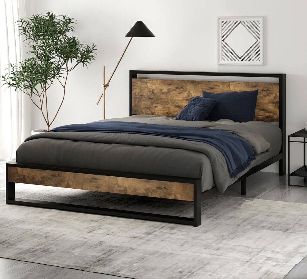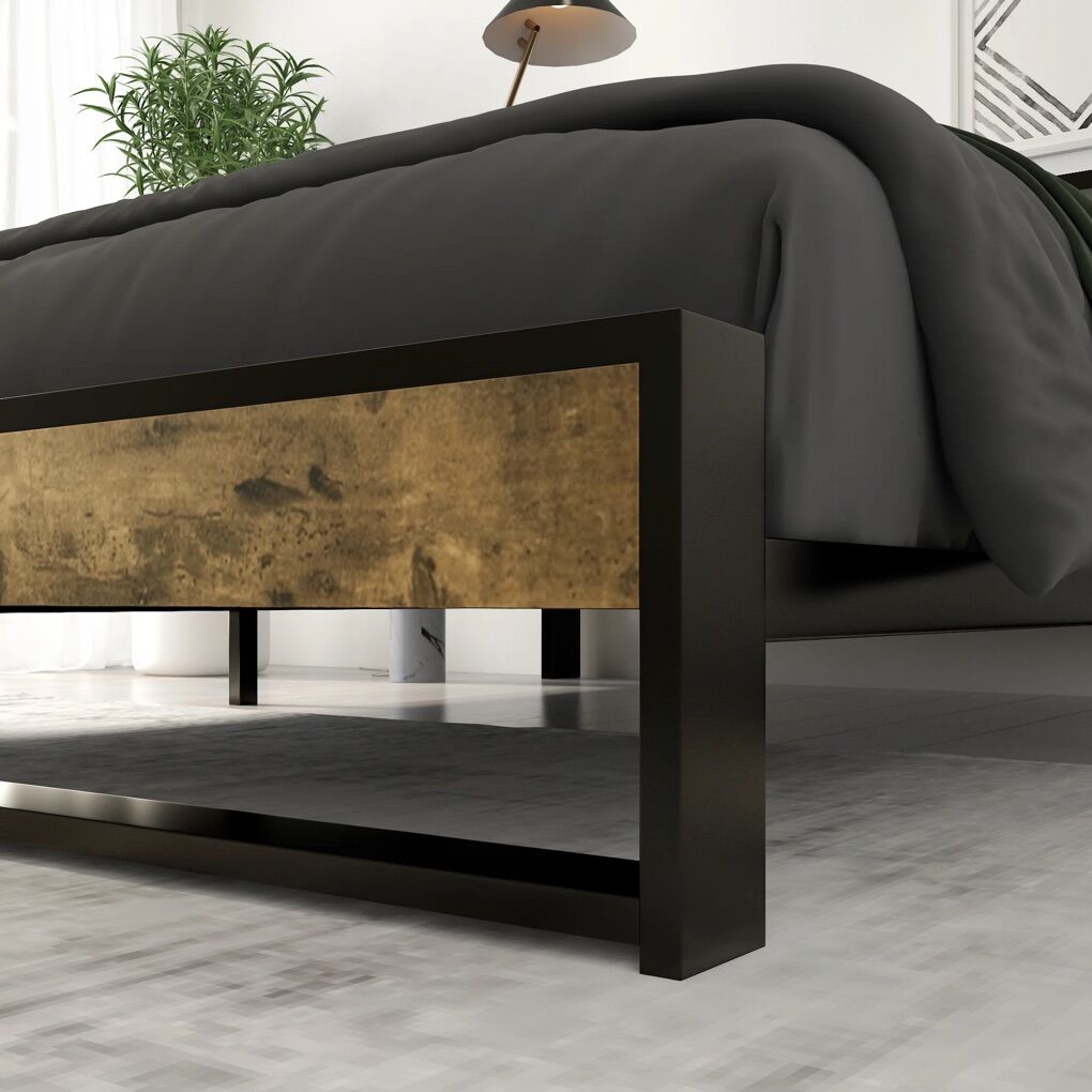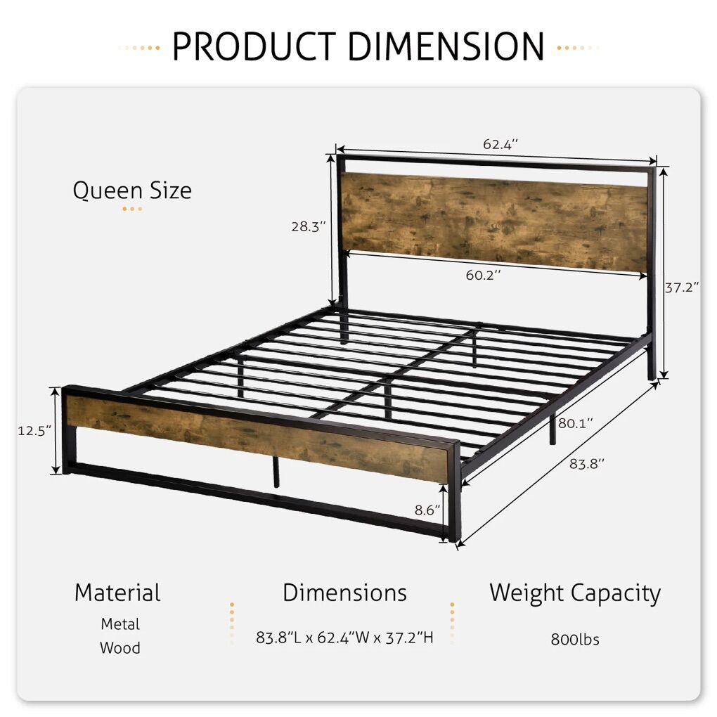 Industrial Style: The contrast of wooden panels and black metal frame evokes a strong industrial vibe. No Box Spring Needed: With strong metal slats and a sturdy steel frame, you can sleep on this bed without a bulky box spring or any other extra foundation, which helps prolong the service life of your latex, memory foam, or spring mattress (mattress not included) Noise Free: The Non-slip strips pressed the slats and unique rubber lock design helps stabilize the bed frame and prevent noise. Plastic foot plugs added to the bottom of the bed feet will never scratch your beloved floor. Space Saving: 8 under bed clearance provides extra storage space. You can put your suitcase, shoe box, and some storage supplies. Make your bedroom more tidy and organized. Easy Assembly: All the required hardware and tools are efficiently packed in a box. It takes 30 mins to complete by following the instructions.