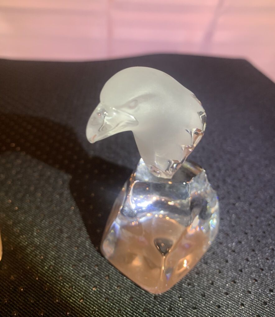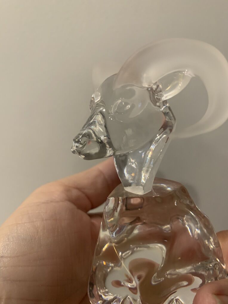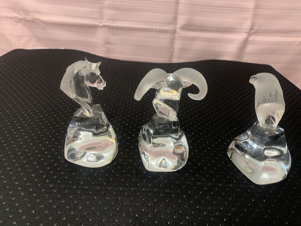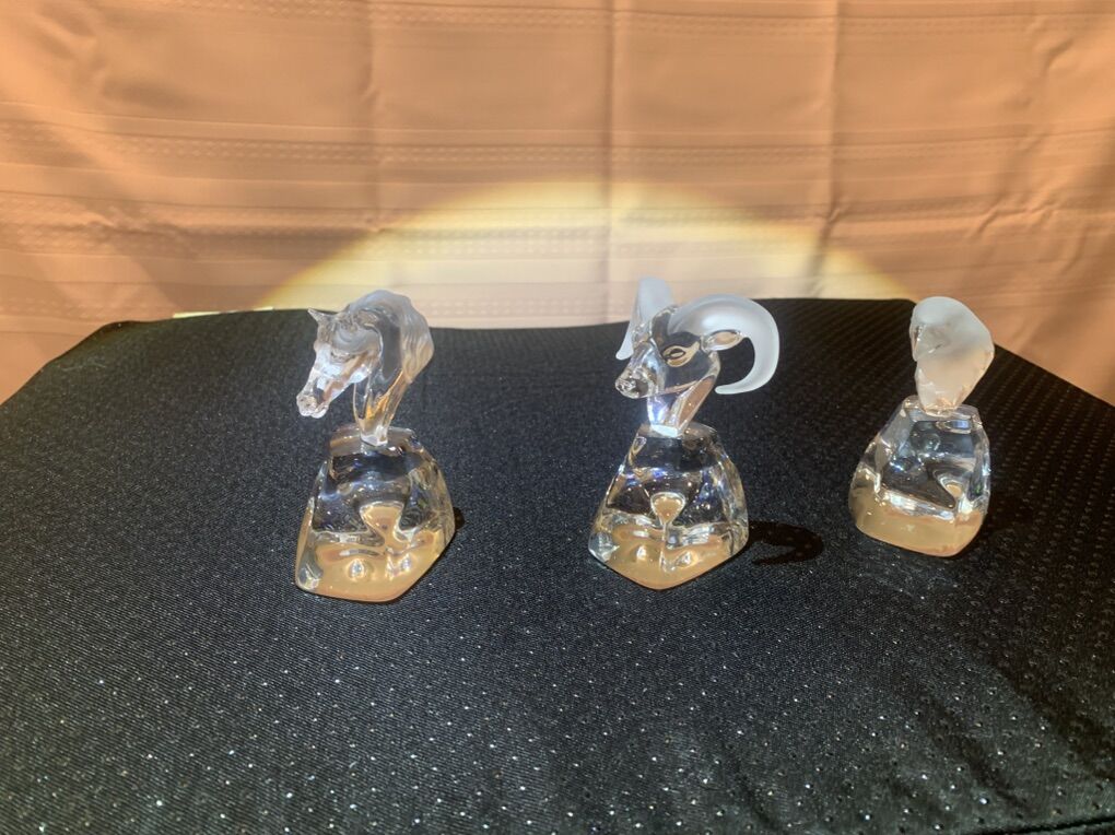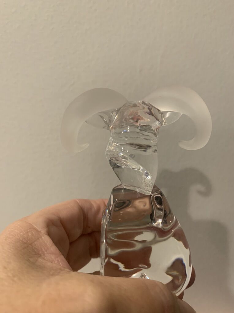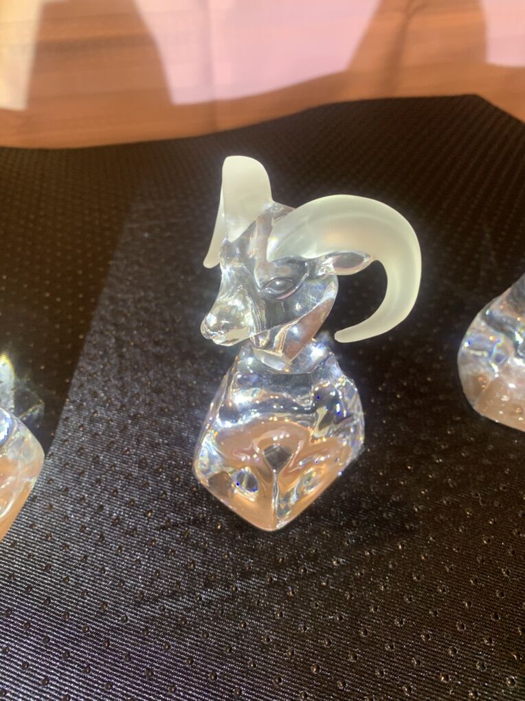 The Swarovski Ebeling & Reuss Crystal Long Horned Ram Head / Bald Eagle / Mustang Horse with Frosted tips is a crystal figurine created in collaboration between Swarovski and Ebeling & Reuss (E&R). They a collectible pieces from the Crystal Signatures line produced in the early 1980s. Key features: Design: Features a clear crystal ram head with frosted horns. Clear Mustang head with frosted mane. And a Frosted crystal head with clear beak