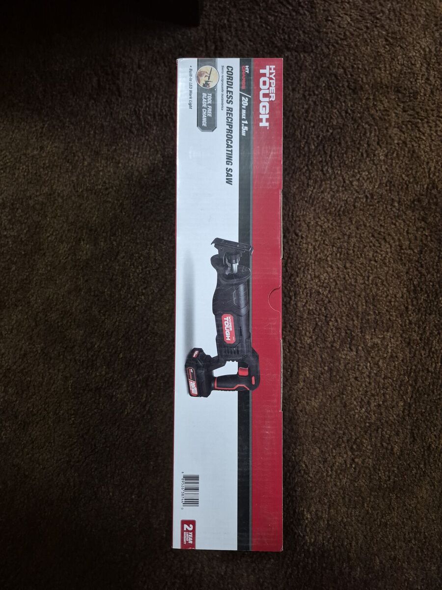 The Hyper Tough 20V Max Lithium-ion Cordless Reciprocating Saw, Variable Speed, Keyless Blade Change, with 1.5Ah Lithium-ion Battery and Charger, Wood Blade and LED Light makes a great addition to any workshop. This compact reciprocating saw is lightweight but powerful. The 20V cordless reciprocating battery powered saw delivers a no load speed of 3000 RPMs for fast accurate cutting and can be used where AC power is not closely available. The 20V max reciprocating saw is well balanced with an ergonomically designed handle for effortless cutting and control whether doing demolition work, tree trimming or cutting oversized material or metal. The pivoting adjustable shoe adds support, control and helps extend blade life. All standard reciprocating blades can be used and the saw also features tool free blade change, variable speed trigger, 7/8 inch blade stroke length and LED light. The keyless blade clamp makes it easy to quickly change your blades. Comes with a 6 inch 24T reciprocating saw blade.